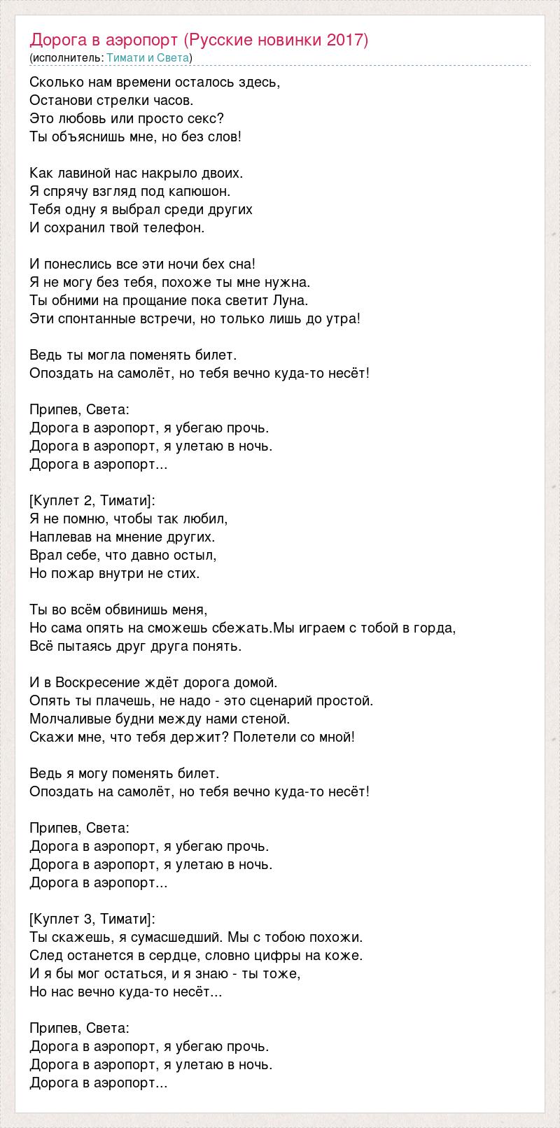 Сколько нам времени осталось здесь, Останови стрелки часов. Это любовь или просто секс? Ты объяснишь мне, но без слов! Как лавиной нас накрыло двоих. Я спрячу взгляд под капюшон. Тебя одну я выбрал среди других И сохранил твой телефон. И понеслись все эти ночи бех сна! Я не могу без тебя, похоже ты мне нужна. Ты обними на прощание пока светит Луна. Эти спонтанные встречи, но только лишь до утра! Ведь ты могла поменять билет. Опоздать на самолёт, но тебя вечно куда-то несёт! Припев, Света: Дорога в аэропорт, я убегаю прочь. Дорога в аэропорт, я улетаю в ночь. Дорога в аэропорт... [Куплет 2, Тимати]: Я не помню, чтобы так любил, Наплевав на мнение других. Врал себе, что давно остыл, Но пожар внутри не стих. Ты во всём обвинишь меня, Но сама опять на сможешь сбежать.Мы играем с тобой в горда, Всё пытаясь друг друга понять. И в Воскресение ждёт дорога домой. Опять ты плачешь, не надо - это сценарий простой. Молчаливые будни между нами стеной. Скажи мне, что тебя держит? Полетели со мной! Ведь я могу поменять билет. Опоздать на самолёт, но тебя вечно куда-то несёт! Припев, Света: Дорога в аэропорт, я убегаю прочь. Дорога в аэропорт, я улетаю в ночь. Дорога в аэропорт... [Куплет 3, Тимати]: Ты скажешь, я сумасшедший. Мы с тобою похожи. След останется в сердце, словно цифры на коже. И я бы мог остаться, и я знаю - ты тоже, Но нас вечно куда-то несёт... Припев, Света: Дорога в аэропорт, я убегаю прочь. Дорога в аэропорт, я улетаю в ночь. Дорога в аэропорт...
