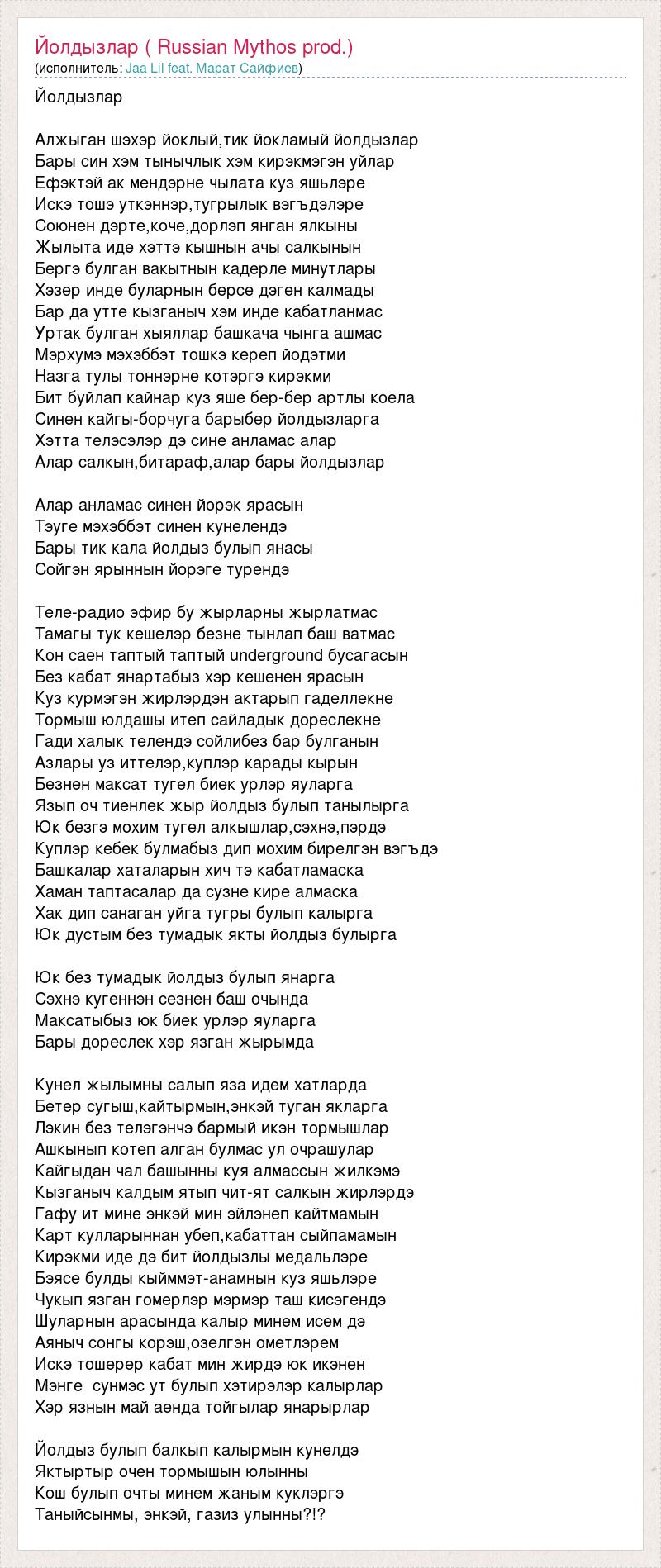 Йолдызлар Алжыган шэхэр йоклый,тик йокламый йолдызлар Бары син хэм тынычлык хэм кирэкмэгэн уйлар Ефэктэй ак мендэрне чылата куз яшьлэре Искэ тошэ уткэннэр,тугрылык вэгъдэлэре Союнен дэрте,коче,дорлэп янган ялкыны Жылыта иде хэттэ кышнын ачы салкынын Бергэ булган вакытнын кадерле минутлары Хэзер инде буларнын берсе дэген калмады Бар да утте кызганыч хэм инде кабатланмас Уртак булган хыяллар башкача чынга ашмас Мэрхумэ мэхэббэт тошкэ кереп йодэтми Назга тулы тоннэрне котэргэ кирэкми Бит буйлап кайнар куз яше бер-бер артлы коела Синен кайгы-борчуга барыбер йолдызларга Хэтта телэсэлэр дэ сине анламас алар Алар салкын,битараф,алар бары йолдызлар Алар анламас синен йорэк ярасын Тэуге мэхэббэт синен кунелендэ Бары тик кала йолдыз булып янасы Сойгэн ярыннын йорэге турендэ Теле-радио эфир бу жырларны жырлатмас Тамагы тук кешелэр безне тынлап баш ватмас Кон саен таптый таптый underground бусагасын Без кабат янартабыз хэр кешенен ярасын Куз курмэгэн жирлэрдэн актарып гаделлекне Тормыш юлдашы итеп сайладык дореслекне Гади халык телендэ сойлибез бар булганын Азлары уз иттелэр,куплэр карады кырын Безнен максат тугел биек урлэр яуларга Язып оч тиенлек жыр йолдыз булып танылырга Юк безгэ мохим тугел алкышлар,сэхнэ,пэрдэ Куплэр кебек булмабыз дип мохим бирелгэн вэгъдэ Башкалар хаталарын хич тэ кабатламаска Хаман таптасалар да сузне кире алмаска Хак дип санаган уйга тугры булып калырга Юк дустым без тумадык якты йолдыз булырга Юк без тумадык йолдыз булып янарга Сэхнэ кугеннэн сезнен баш очында Максатыбыз юк биек урлэр яуларга Бары дореслек хэр язган жырымда Кунел жылымны салып яза идем хатларда Бетер сугыш,кайтырмын,энкэй туган якларга Лэкин без телэгэнчэ бармый икэн тормышлар Ашкынып котеп алган булмас ул очрашулар Кайгыдан чал башынны куя алмассын жилкэмэ Кызганыч калдым ятып чит-ят салкын жирлэрдэ Гафу ит мине энкэй мин эйлэнеп кайтмамын Карт кулларыннан убеп,кабаттан сыйпамамын Кирэкми иде дэ бит йолдызлы медальлэре Бэясе булды кыйммэт-анамнын куз яшьлэре Чукып язган гомерлэр мэрмэр таш кисэгендэ Шуларнын арасында калыр минем исем дэ Аяныч сонгы корэш,озелгэн ометлэрем Искэ тошерер кабат мин жирдэ юк икэнен Мэнге сунмэс ут булып хэтирэлэр калырлар Хэр язнын май аенда тойгылар янарырлар Йолдыз булып балкып калырмын кунелдэ Яктыртыр очен тормышын юлынны Кош булып очты минем жаным куклэргэ Таныйсынмы, энкэй, газиз улынны?!?