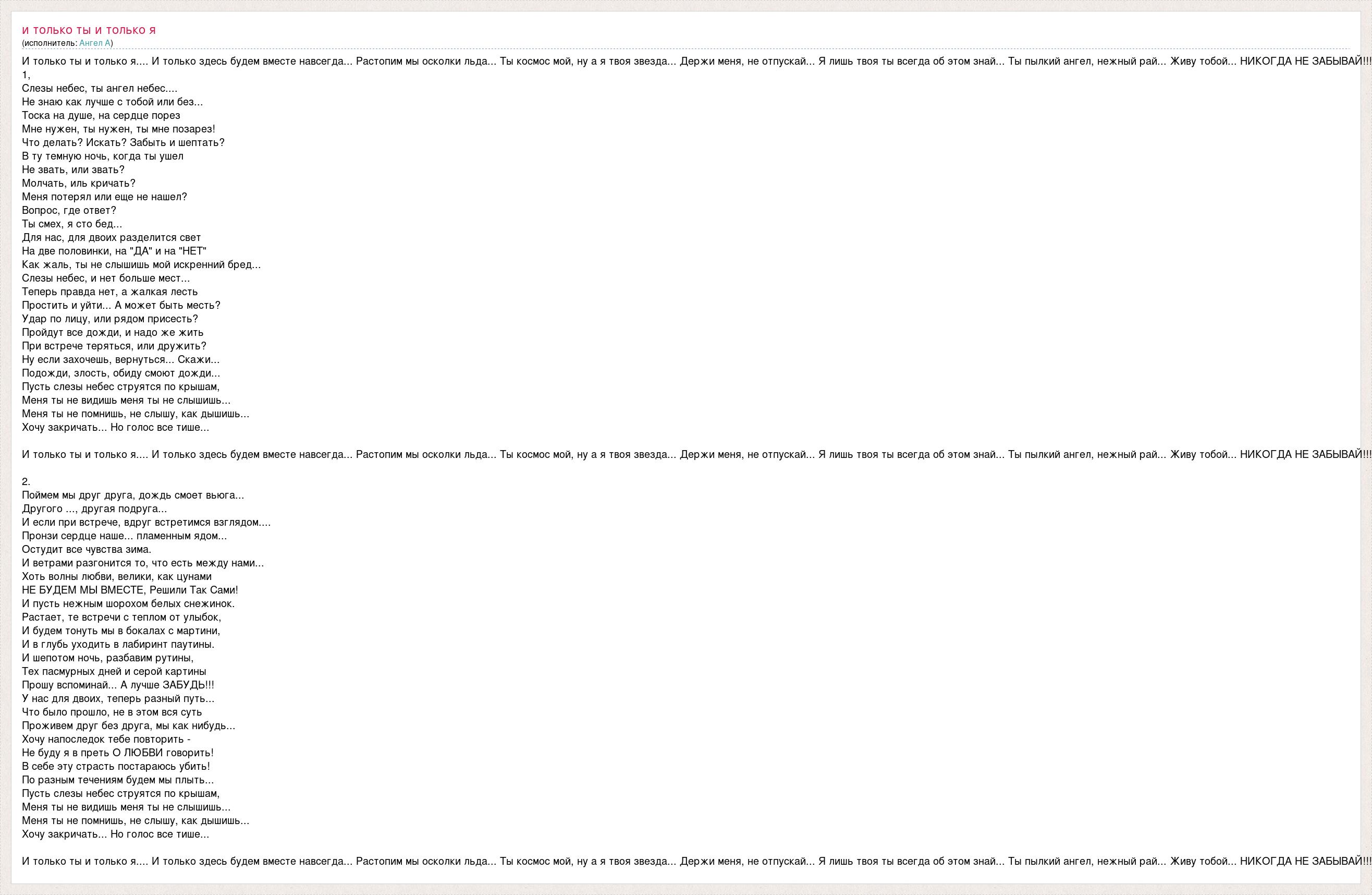 И только ты и только я.... И только здесь будем вместе навсегда... Растопим мы осколки льда... Ты космос мой, ну а я твоя звезда... Держи меня, не отпускай... Я лишь твоя ты всегда об этом знай... Ты пылкий ангел, нежный рай... Живу тобой... НИКОГДА НЕ ЗАБЫВАЙ!!! 1, Слезы небес, ты ангел небес.... Не знаю как лучше с тобой или без... Тоска на душе, на сердце порез Мне нужен, ты нужен, ты мне позарез! Что делать? Искать? Забыть и шептать? В ту темную ночь, когда ты ушел Не звать, или звать? Молчать, иль кричать? Меня потерял или еще не нашел? Вопрос, где ответ? Ты смех, я сто бед... Для нас, для двоих разделится свет На две половинки, на "ДА" и на "НЕТ" Как жаль, ты не слышишь мой искренний бред... Слезы небес, и нет больше мест... Теперь правда нет, а жалкая лесть Простить и уйти... А может быть месть? Удар по лицу, или рядом присесть? Пройдут все дожди, и надо же жить При встрече теряться, или дружить? Ну если захочешь, вернуться... Скажи... Подожди, злость, обиду смоют дожди... Пусть слезы небес струятся по крышам, Меня ты не видишь меня ты не слышишь... Меня ты не помнишь, не слышу, как дышишь... Хочу закричать... Но голос все тише... И только ты и только я.... И только здесь будем вместе навсегда... Растопим мы осколки льда... Ты космос мой, ну а я твоя звезда... Держи меня, не отпускай... Я лишь твоя ты всегда об этом знай... Ты пылкий ангел, нежный рай... Живу тобой... НИКОГДА НЕ ЗАБЫВАЙ!!! 2. Поймем мы друг друга, дождь смоет вьюга... Другого ..., другая подруга... И если при встрече, вдруг встретимся взглядом.... Пронзи сердце наше... пламенным ядом... Остудит все чувства зима. И ветрами разгонится то, что есть между нами... Хоть волны любви, велики, как цунами НЕ БУДЕМ МЫ ВМЕСТЕ, Решили Так Сами! И пусть нежным шорохом белых снежинок. Растает, те встречи с теплом от улыбок, И будем тонуть мы в бокалах с мартини, И в глубь уходить в лабиринт паутины. И шепотом ночь, разбавим рутины, Тех пасмурных дней и серой картины Прошу вспоминай... А лучше ЗАБУДЬ!!! У нас для двоих, теперь разный путь... Что было прошло, не в этом вся суть Проживем друг без друга, мы как нибудь... Хочу напоследок тебе повторить - Не буду я в преть О ЛЮБВИ говорить! В себе эту страсть постараюсь убить! По разным течениям будем мы плыть... Пусть слезы небес струятся по крышам, Меня ты не видишь меня ты не слышишь... Меня ты не помнишь, не слышу, как дышишь... Хочу закричать... Но голос все тише... И только ты и только я.... И только здесь будем вместе навсегда... Растопим мы осколки льда... Ты космос мой, ну а я твоя звезда... Держи меня, не отпускай... Я лишь твоя ты всегда об этом знай... Ты пылкий ангел, нежный рай... Живу тобой... НИКОГДА НЕ ЗАБЫВАЙ!!!