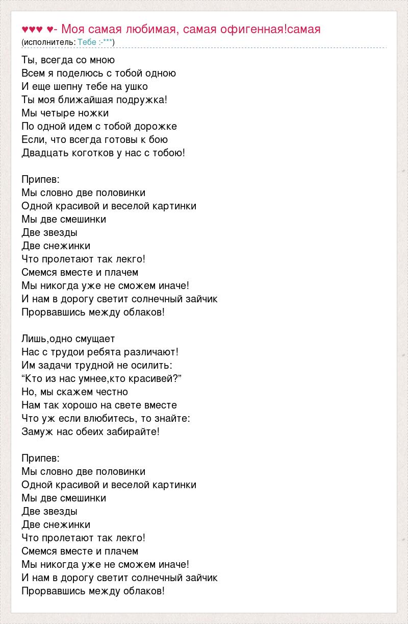 Ты, всегда со мною Всем я поделюсь с тобой одною И еще шепну тебе на ушко Ты моя ближайшая подружка! Мы четыре ножки По одной идем с тобой дорожке Если, что всегда готовы к бою Двадцать коготков у нас с тобою! Припев: Мы словно две половинки Одной красивой и веселой картинки Мы две смешинки Две звезды Две снежинки Что пролетают так лекго! Смемся вместе и плачем Мы никогда уже не сможем иначе! И нам в дорогу светит солнечный зайчик Прорвавшись между облаков! Лишь,одно смущает Нас с трудои ребята различают! Им задачи трудной не осилить: “Кто из нас умнее,кто красивей?” Но, мы скажем честно Нам так хорошо на свете вместе Что уж если влюбитесь, то знайте: Замуж нас обеих забирайте! Припев: Мы словно две половинки Одной красивой и веселой картинки Мы две смешинки Две звезды Две снежинки Что пролетают так лекго! Смемся вместе и плачем Мы никогда уже не сможем иначе! И нам в дорогу светит солнечный зайчик Прорвавшись между облаков!