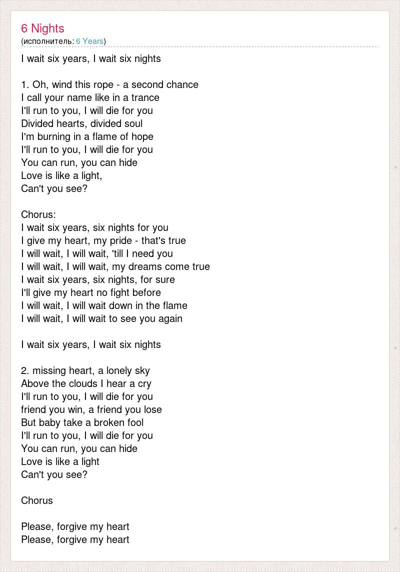 I wait six years, I wait six nights 1. Oh, wind this rope - a second chance I call your name like in a trance I'll run to you, I will die for you Divided hearts, divided soul I'm burning in a flame of hope I'll run to you, I will die for you You can run, you can hide Love is like a light, Can't you see? Chorus: I wait six years, six nights for you I give my heart, my pride - that's true I will wait, I will wait, 'till I need you I will wait, I will wait, my dreams come true I wait six years, six nights, for sure I'll give my heart no fight before I will wait, I will wait down in the flame I will wait, I will wait to see you again I wait six years, I wait six nights 2. missing heart, a lonely sky Above the clouds I hear a cry I'll run to you, I will die for you friend you win, a friend you lose But baby take a broken fool I'll run to you, I will die for you You can run, you can hide Love is like a light Can't you see? Chorus Please, forgive my heart Please, forgive my heart