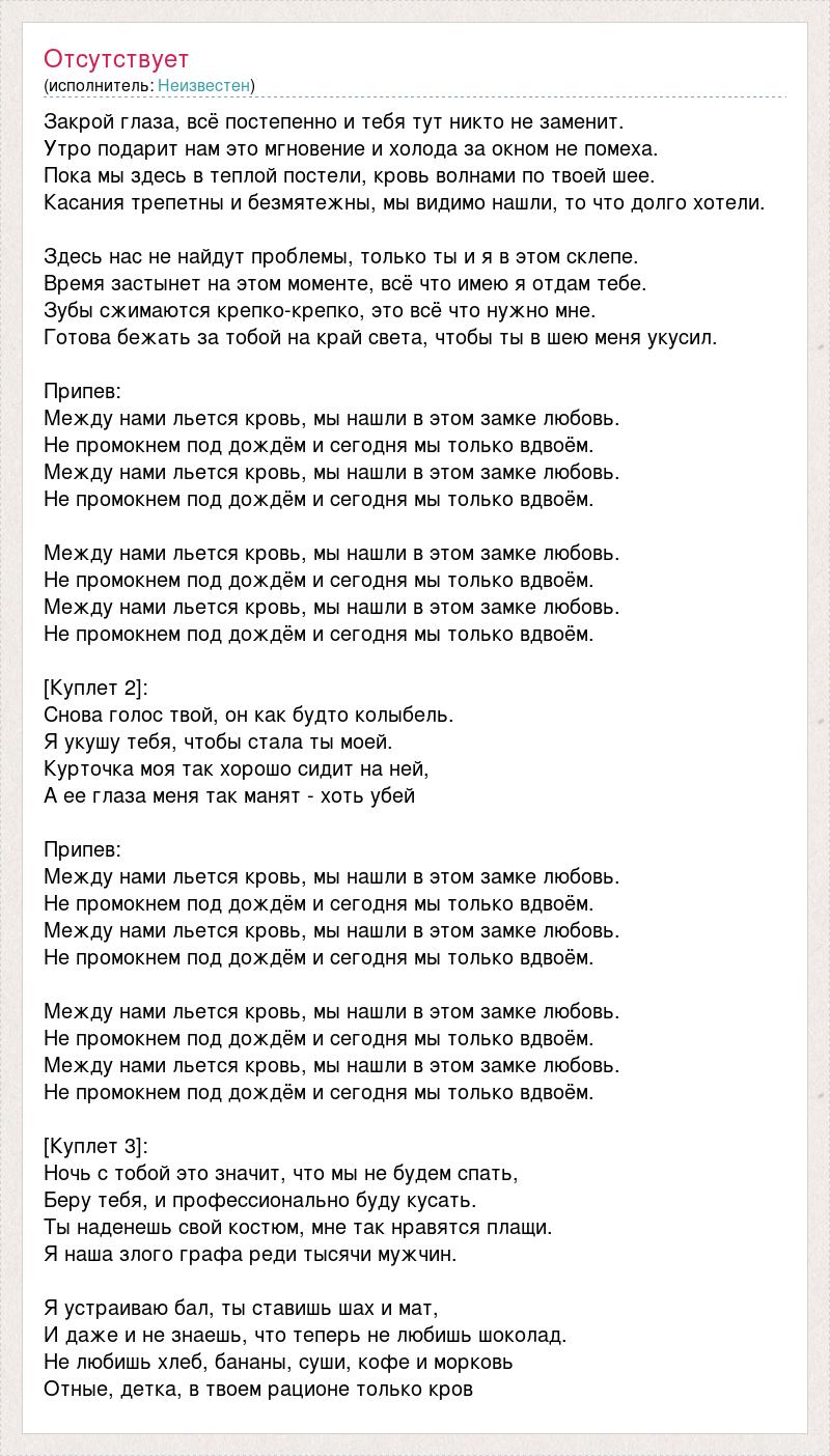 Закрой глаза, всё постепенно и тебя тут никто не заменит. Утро подарит нам это мгновение и холода за окном не помеха. Пока мы здесь в теплой постели, кровь волнами по твоей шее. Касания трепетны и безмятежны, мы видимо нашли, то что долго хотели. Здесь нас не найдут проблемы, только ты и я в этом склепе. Время застынет на этом моменте, всё что имею я отдам тебе. Зубы сжимаются крепко-крепко, это всё что нужно мне. Готова бежать за тобой на край света, чтобы ты в шею меня укусил. Припев: Между нами льется кровь, мы нашли в этом замке любовь. Не промокнем под дождём и сегодня мы только вдвоём. Между нами льется кровь, мы нашли в этом замке любовь. Не промокнем под дождём и сегодня мы только вдвоём. Между нами льется кровь, мы нашли в этом замке любовь. Не промокнем под дождём и сегодня мы только вдвоём. Между нами льется кровь, мы нашли в этом замке любовь. Не промокнем под дождём и сегодня мы только вдвоём. [Куплет 2]: Снова голос твой, он как будто колыбель. Я укушу тебя, чтобы стала ты моей. Курточка моя так хорошо сидит на ней, А ее глаза меня так манят - хоть убей Припев: Между нами льется кровь, мы нашли в этом замке любовь. Не промокнем под дождём и сегодня мы только вдвоём. Между нами льется кровь, мы нашли в этом замке любовь. Не промокнем под дождём и сегодня мы только вдвоём. Между нами льется кровь, мы нашли в этом замке любовь. Не промокнем под дождём и сегодня мы только вдвоём. Между нами льется кровь, мы нашли в этом замке любовь. Не промокнем под дождём и сегодня мы только вдвоём. [Куплет 3]: Ночь с тобой это значит, что мы не будем спать, Беру тебя, и профессионально буду кусать. Ты наденешь свой костюм, мне так нравятся плащи. Я наша злого графа реди тысячи мужчин. Я устраиваю бал, ты ставишь шах и мат, И даже и не знаешь, что теперь не любишь шоколад. Не любишь хлеб, бананы, суши, кофе и морковь Отные, детка, в твоем рационе только кров