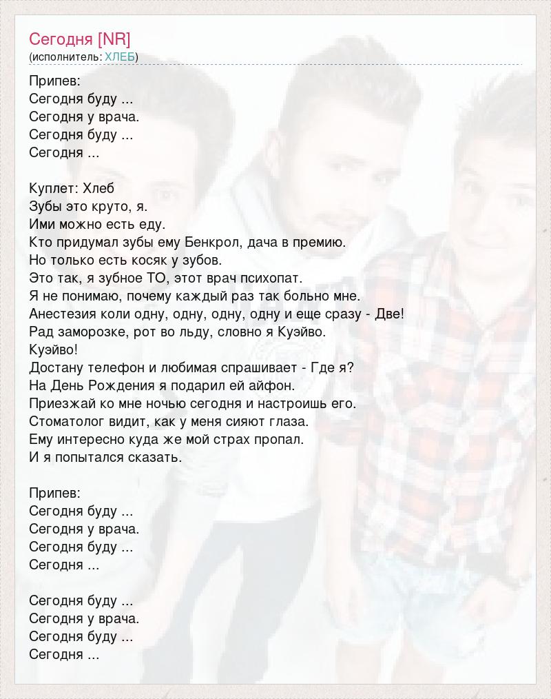 Припев: Сегодня буду ... Сегодня у врача. Сегодня буду ... Сегодня ... Куплет: Хлеб Зубы это круто, я. Ими можно есть еду. Кто придумал зубы ему Бенкрол, дача в премию. Но только есть косяк у зубов. Это так, я зубное ТО, этот врач психопат. Я не понимаю, почему каждый раз так больно мне. Анестезия коли одну, одну, одну, одну и еще сразу - Две! Рад заморозке, рот во льду, словно я Куэйво. Куэйво! Достану телефон и любимая спрашивает - Где я? На День Рождения я подарил ей айфон. Приезжай ко мне ночью сегодня и настроишь его. Стоматолог видит, как у меня сияют глаза. Ему интересно куда же мой страх пропал. И я попытался сказать. Припев: Сегодня буду ... Сегодня у врача. Сегодня буду ... Сегодня ... Сегодня буду ... Сегодня у врача. Сегодня буду ... Сегодня ...