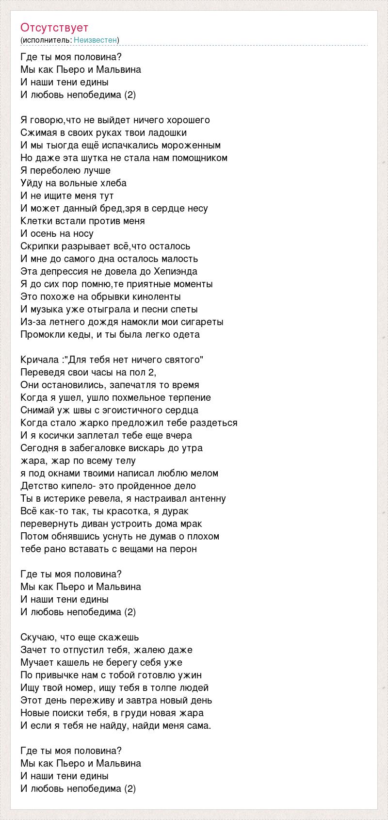 Где ты моя половина? Мы как Пьеро и Мальвина И наши тени едины И любовь непобедима (2) Я говорю,что не выйдет ничего хорошего Сжимая в своих руках твои ладошки И мы тыогда ещё испачкались мороженным Но даже эта шутка не стала нам помощником Я переболею лучше Уйду на вольные хлеба И не ищите меня тут И может данный бред,зря в сердце несу Клетки встали против меня И осень на носу Скрипки разрывает всё,что осталось И мне до самого дна осталось малость Эта депрессия не довела до Хепиэнда Я до сих пор помню,те приятные моменты Это похоже на обрывки киноленты И музыка уже отыграла и песни спеты Из-за летнего дождя намокли мои сигареты Промокли кеды, и ты была легко одета Кричала :"Для тебя нет ничего святого" Переведя свои часы на пол 2, Они остановились, запечатля то время Когда я ушел, ушло похмельное терпение Снимай уж швы с эгоистичного сердца Когда стало жарко предложил тебе раздеться И я косички заплетал тебе еще вчера Сегодня в забегаловке вискарь до утра жара, жар по всему телу я под окнами твоими написал люблю мелом Детство кипело- это пройденное дело Ты в истерике ревела, я настраивал антенну Всё как-то так, ты красотка, я дурак перевернуть диван устроить дома мрак Потом обнявшись уснуть не думав о плохом тебе рано вставать с вещами на перон Где ты моя половина? Мы как Пьеро и Мальвина И наши тени едины И любовь непобедима (2) Скучаю, что еще скажешь Зачет то отпустил тебя, жалею даже Мучает кашель не берегу себя уже По привычке нам с тобой готовлю ужин Ищу твой номер, ищу тебя в толпе людей Этот день переживу и завтра новый день Новые поиски тебя, в груди новая жара И если я тебя не найду, найди меня сама. Где ты моя половина? Мы как Пьеро и Мальвина И наши тени едины И любовь непобедима (2)