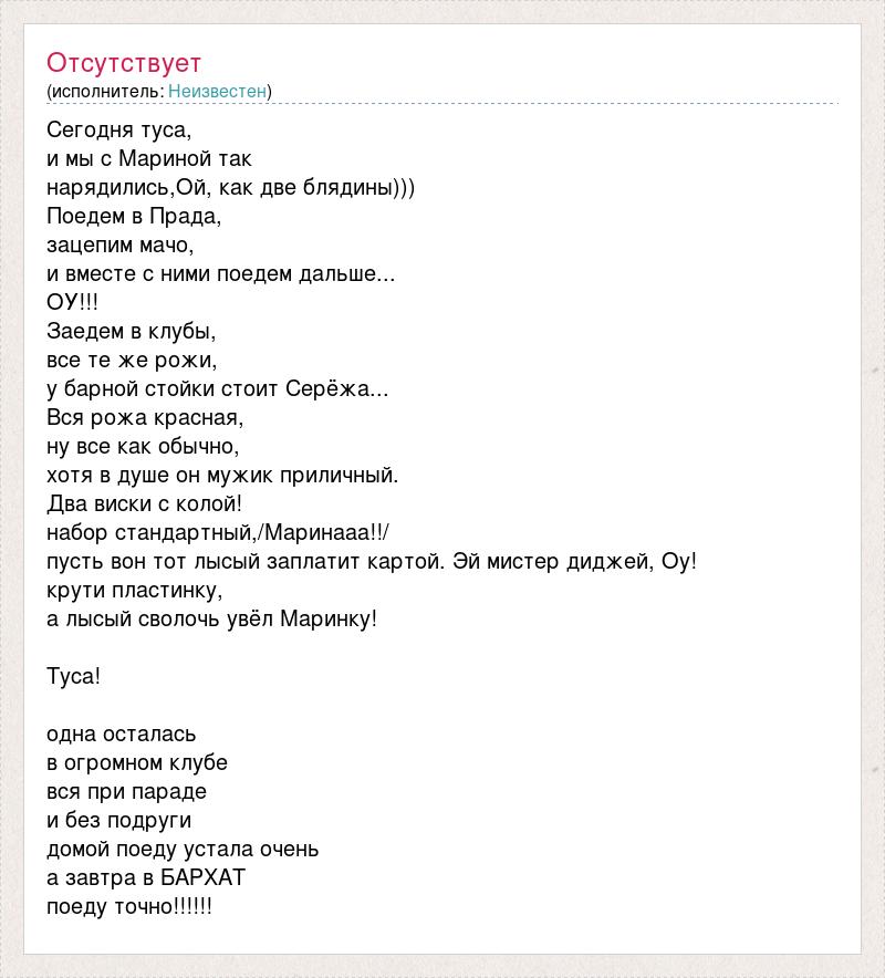 Сегодня туса, и мы с Мариной так нарядились,Ой, как две блядины))) Поедем в Прада, зацепим мачо, и вместе с ними поедем дальше... ОУ!!! Заедем в клубы, все те же рожи, у барной стойки стоит Серёжа... Вся рожа красная, ну все как обычно, хотя в душе он мужик приличный. Два виски с колой! набор стандартный,/Маринааа!!/ пусть вон тот лысый заплатит картой. Эй мистер диджей, Оу! крути пластинку, а лысый сволочь увёл Маринку! Туса! одна осталась в огромном клубе вся при параде и без подруги домой поеду устала очень а завтра в БАРХАТ поеду точно!!!!!!