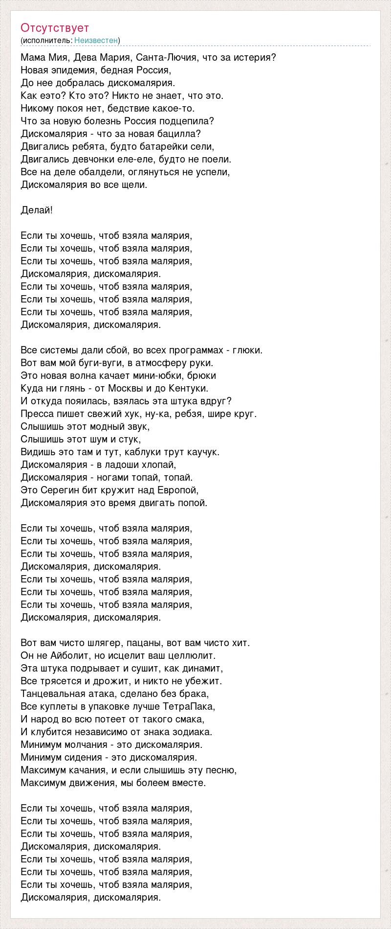 Мама Мия, Дева Мария, Санта-Лючия, что за истерия? Новая эпидемия, бедная Россия, До нее добралась дискомалярия. Как еэто? Кто это? Никто не знает, что это. Никому покоя нет, бедствие какое-то. Что за новую болезнь Россия подцепила? Дискомалярия - что за новая бацилла? Двигались ребята, будто батарейки сели, Двигались девчонки еле-еле, будто не поели. Все на деле обалдели, оглянуться не успели, Дискомалярия во все щели. Делай! Если ты хочешь, чтоб взяла малярия, Если ты хочешь, чтоб взяла малярия, Если ты хочешь, чтоб взяла малярия, Дискомалярия, дискомалярия. Если ты хочешь, чтоб взяла малярия, Если ты хочешь, чтоб взяла малярия, Если ты хочешь, чтоб взяла малярия, Дискомалярия, дискомалярия. Все системы дали сбой, во всех программах - глюки. Вот вам мой буги-вуги, в атмосферу руки. Это новая волна качает мини-юбки, брюки Куда ни глянь - от Москвы и до Кентуки. И откуда пояилась, взялась эта штука вдруг? Пресса пишет свежий хук, ну-ка, ребзя, шире круг. Слышишь этот модный звук, Слышишь этот шум и стук, Видишь это там и тут, каблуки трут каучук. Дискомалярия - в ладоши хлопай, Дискомалярия - ногами топай, топай. Это Серегин бит кружит над Европой, Дискомалярия это время двигать попой. Если ты хочешь, чтоб взяла малярия, Если ты хочешь, чтоб взяла малярия, Если ты хочешь, чтоб взяла малярия, Дискомалярия, дискомалярия. Если ты хочешь, чтоб взяла малярия, Если ты хочешь, чтоб взяла малярия, Если ты хочешь, чтоб взяла малярия, Дискомалярия, дискомалярия. Вот вам чисто шлягер, пацаны, вот вам чисто хит. Он не Айболит, но исцелит ваш целлюлит. Эта штука подрывает и сушит, как динамит, Все трясется и дрожит, и никто не убежит. Танцевальная атака, сделано без брака, Все куплеты в упаковке лучше ТетраПака, И народ во всю потеет от такого смака, И клубится независимо от знака зодиака. Минимум молчания - это дискомалярия. Минимум сидения - это дискомалярия. Максимум качания, и если слышишь эту песню, Максимум движения, мы болеем вместе. Если ты хочешь, чтоб взяла малярия, Если ты хочешь, чтоб взяла малярия, Если ты хочешь, чтоб взяла малярия, Дискомалярия, дискомалярия. Если ты хочешь, чтоб взяла малярия, Если ты хочешь, чтоб взяла малярия, Если ты хочешь, чтоб взяла малярия, Дискомалярия, дискомалярия.