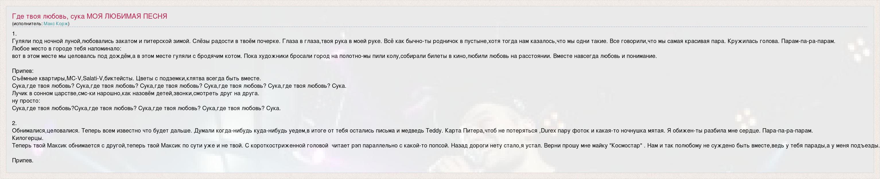 1. Гуляли под ночной луной,любовались закатом и питерской зимой. Слёзы радости в твоём почерке. Глаза в глаза,твоя рука в моей руке. Всё как бычно-ты родничок в пустыне,хотя тогда нам казалось,что мы одни такие. Все говорили,что мы самая красивая пара. Кружилась голова. Парам-па-ра-парам. Любое место в городе тебя напоминало: вот в этом месте мы целовалсь под дождём,а в этом месте гуляли с бродячим котом. Пока художники бросали город на полотно-мы пили колу,собирали билеты в кино,любили любовь на расстоянии. Вместе навсегда любовь и понимание. Припев: Съёмные квартиры,MC-V,Salati-V,биктейсты. Цветы с подземки,клятва всегда быть вместе. Сука,где твоя любовь? Сука,где твоя любовь? Сука,где твоя любовь? Сука,где твоя любовь? Сука,где твоя любовь? Сука. Лучик в сонном царстве,смс-ки нарошно,как назовём детей,звонки,смотреть друг на друга. ну просто: Сука,где твоя любовь?Сука,где твоя любовь? Сука,где твоя любовь? Сука,где твоя любовь? Сука. 2. Обнималися,целовалися. Теперь всем известно что будет дальше. Думали когда-нибудь куда-нибудь уедем,в итоге от тебя остались письма и медведь Teddy. Карта Питера,чтоб не потеряться ,Durex пару фоток и какая-то ночнушка мятая. Я обижен-ты разбила мне сердце. Пара-па-ра-парам. Килогерцы. Теперь твой Максик обнимается с другой,теперь твой Максик по сути уже и не твой. С короткостриженной головой читает рэп параллельно с какой-то попсой. Назад дороги нету стало,я устал. Верни прошу мне майку "Космостар" . Нам и так полюбому не суждено быть вместе,ведь у тебя парады,а у меня подъезды. Припев.