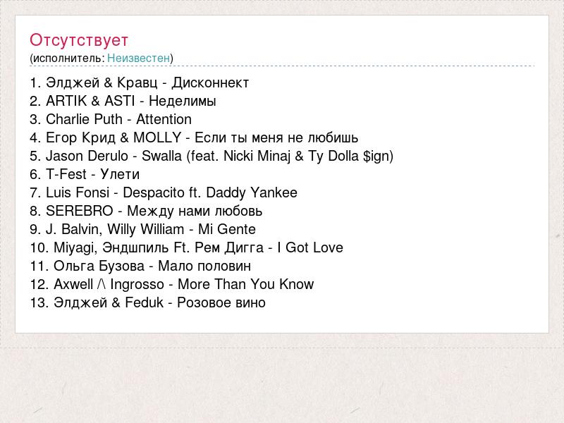 1. Элджей & Кравц - Дисконнект 2. ARTIK & ASTI - Неделимы 3. Charlie Puth - Attention 4. Егор Крид & MOLLY - Если ты меня не любишь 5. Jason Derulo - Swalla (feat. Nicki Minaj & Ty Dolla $ign) 6. T-Fest - Улети 7. Luis Fonsi - Despacito ft. Daddy Yankee 8. SEREBRO - Между нами любовь 9. J. Balvin, Willy William - Mi Gente 10. Miyagi, Эндшпиль Ft. Рем Дигга - I Got Love 11. Ольга Бузова - Мало половин 12. Axwell /\ Ingrosso - More Than You Know 13. Элджей & Feduk - Розовое вино