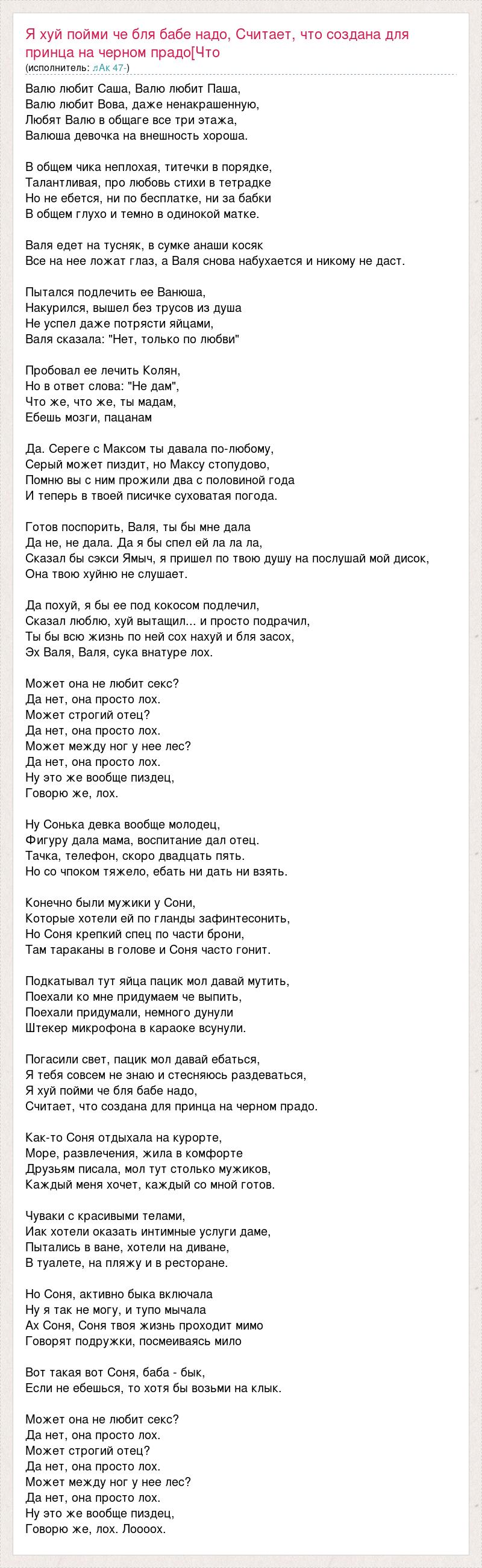 Валю любит Саша, Валю любит Паша, Валю любит Вова, даже ненакрашенную, Любят Валю в общаге все три этажа, Валюша девочка на внешность хороша. В общем чика неплохая, титечки в порядке, Талантливая, про любовь стихи в тетрадке Но не ебется, ни по бесплатке, ни за бабки В общем глухо и темно в одинокой матке. Валя едет на тусняк, в сумке анаши косяк Все на нее ложат глаз, а Валя снова набухается и никому не даст. Пытался подлечить ее Ванюша, Накурился, вышел без трусов из душа Не успел даже потрясти яйцами, Валя сказала: "Нет, только по любви" Пробовал ее лечить Колян, Но в ответ слова: "Не дам", Что же, что же, ты мадам, Ебешь мозги, пацанам Да. Сереге с Максом ты давала по-любому, Серый может пиздит, но Максу стопудово, Помню вы с ним прожили два с половиной года И теперь в твоей писичке суховатая погода. Готов поспорить, Валя, ты бы мне дала Да не, не дала. Да я бы спел ей ла ла ла, Сказал бы сэкси Ямыч, я пришел по твою душу на послушай мой дисок, Она твою хуйню не слушает. Да похуй, я бы ее под кокосом подлечил, Сказал люблю, хуй вытащил... и просто подрачил, Ты бы всю жизнь по ней сох нахуй и бля засох, Эх Валя, Валя, сука внатуре лох. Может она не любит секс? Да нет, она просто лох. Может строгий отец? Да нет, она просто лох. Может между ног у нее лес? Да нет, она просто лох. Ну это же вообще пиздец, Говорю же, лох. Ну Сонька девка вообще молодец, Фигуру дала мама, воспитание дал отец. Тачка, телефон, скоро двадцать пять. Но со чпоком тяжело, ебать ни дать ни взять. Конечно были мужики у Сони, Которые хотели ей по гланды зафинтесонить, Но Соня крепкий спец по части брони, Там тараканы в голове и Соня часто гонит. Подкатывал тут яйца пацик мол давай мутить, Поехали ко мне придумаем че выпить, Поехали придумали, немного дунули Штекер микрофона в караоке всунули. Погасили свет, пацик мол давай ебаться, Я тебя совсем не знаю и стесняюсь раздеваться, Я хуй пойми че бля бабе надо, Считает, что создана для принца на черном прадо. Как-то Соня отдыхала на курорте, Море, развлечения, жила в комфорте Друзьям писала, мол тут столько мужиков, Каждый меня хочет, каждый со мной готов. Чуваки с красивыми телами, Иак хотели оказать интимные услуги даме, Пытались в ване, хотели на диване, В туалете, на пляжу и в ресторане. Но Соня, активно быка включала Ну я так не могу, и тупо мычала Ах Соня, Соня твоя жизнь проходит мимо Говорят подружки, посмеиваясь мило Вот такая вот Соня, баба - бык, Если не ебешься, то хотя бы возьми на клык. Может она не любит секс? Да нет, она просто лох. Может строгий отец? Да нет, она просто лох. Может между ног у нее лес? Да нет, она просто лох. Ну это же вообще пиздец, Говорю же, лох. Лоооох.