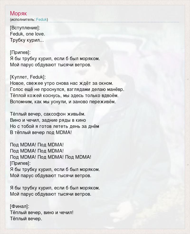 [Вступление]: Feduk, one love. Трубку курил... [Припев]: Я бы трубку курил, если б был моряком. Мой парус обдувают тысячи ветров. [Куплет, Feduk]: Новое, свежее утро снова нас ждёт за окном. Голос ещё не проснулся, взглядами делаю манёвр. Тёплой кожей коснусь, мы здесь только вдвоём. Вспомним, как мы уснули, и заново переживём. Тёплый вечер, саксофон живьём. Вино и чечил, задние ряды в кино Но с тобой я готов лететь день за днём В тёплый вечер под MDMA! Под MDMA! Под MDMA! Под MDMA! Под MDMA! Под MDMA! Под MDMA! Под MDMA! [Припев]: Я бы трубку курил, если б был моряком. Мой парус обдувают тысячи ветров. Я бы трубку курил, если б был моряком. Мой парус обдувают тысячи ветров. [Финал]: Тёплый вечер, вино и чечил! Тёплый вечер.