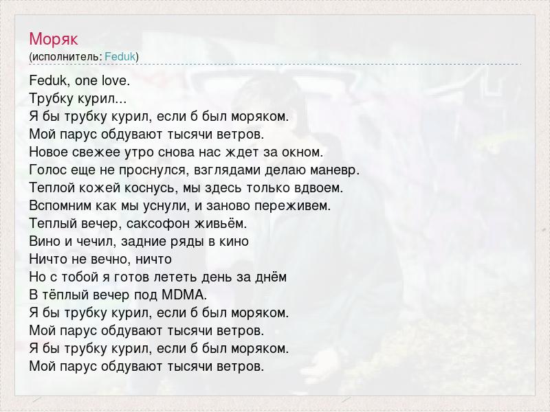 Feduk, one love. Трубку курил... Я бы трубку курил, если б был моряком. Мой парус обдувают тысячи ветров. Новое свежее утро снова нас ждет за окном. Голос еще не проснулся, взглядами делаю маневр. Теплой кожей коснусь, мы здесь только вдвоем. Вспомним как мы уснули, и заново переживем. Теплый вечер, саксофон живьём. Вино и чечил, задние ряды в кино Ничто не вечно, ничто Но с тобой я готов лететь день за днём В тёплый вечер под MDMA. Я бы трубку курил, если б был моряком. Мой парус обдувают тысячи ветров. Я бы трубку курил, если б был моряком. Мой парус обдувают тысячи ветров.