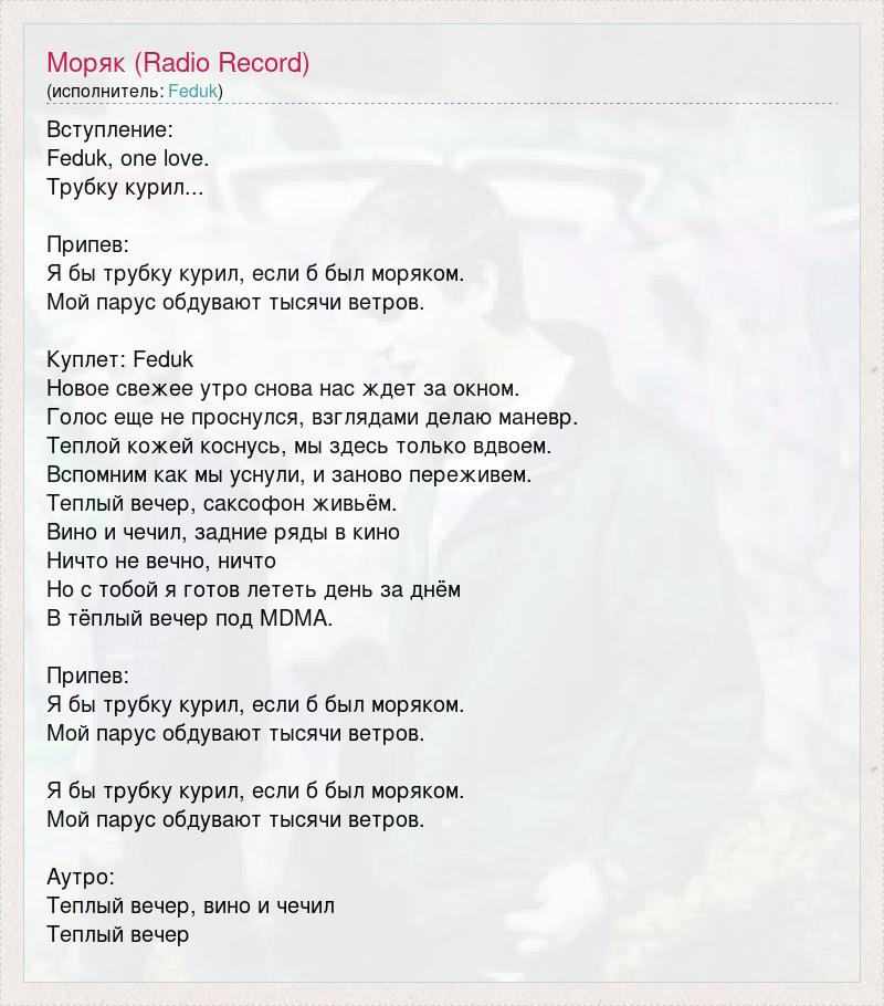 Вступление: Feduk, one love. Трубку курил... Припев: Я бы трубку курил, если б был моряком. Мой парус обдувают тысячи ветров. Куплет: Feduk Новое свежее утро снова нас ждет за окном. Голос еще не проснулся, взглядами делаю маневр. Теплой кожей коснусь, мы здесь только вдвоем. Вспомним как мы уснули, и заново переживем. Теплый вечер, саксофон живьём. Вино и чечил, задние ряды в кино Ничто не вечно, ничто Но с тобой я готов лететь день за днём В тёплый вечер под MDMA. Припев: Я бы трубку курил, если б был моряком. Мой парус обдувают тысячи ветров. Я бы трубку курил, если б был моряком. Мой парус обдувают тысячи ветров. Аутро: Теплый вечер, вино и чечил Теплый вечеp