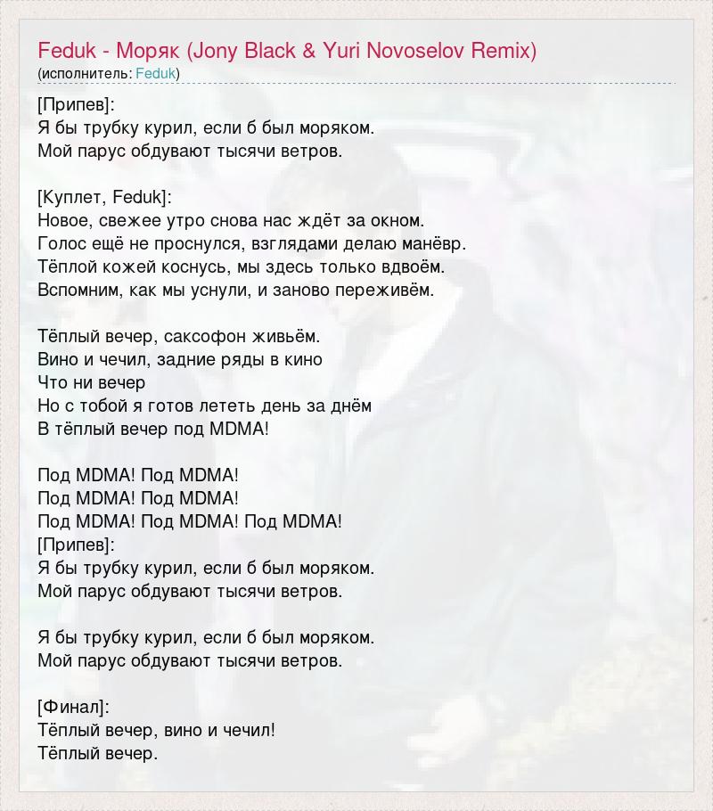 [Припев]: Я бы трубку курил, если б был моряком. Мой парус обдувают тысячи ветров. [Куплет, Feduk]: Новое, свежее утро снова нас ждёт за окном. Голос ещё не проснулся, взглядами делаю манёвр. Тёплой кожей коснусь, мы здесь только вдвоём. Вспомним, как мы уснули, и заново переживём. Тёплый вечер, саксофон живьём. Вино и чечил, задние ряды в кино Что ни вечер Но с тобой я готов лететь день за днём В тёплый вечер под MDMA! Под MDMA! Под MDMA! Под MDMA! Под MDMA! Под MDMA! Под MDMA! Под MDMA! [Припев]: Я бы трубку курил, если б был моряком. Мой парус обдувают тысячи ветров. Я бы трубку курил, если б был моряком. Мой парус обдувают тысячи ветров. [Финал]: Тёплый вечер, вино и чечил! Тёплый вечер.