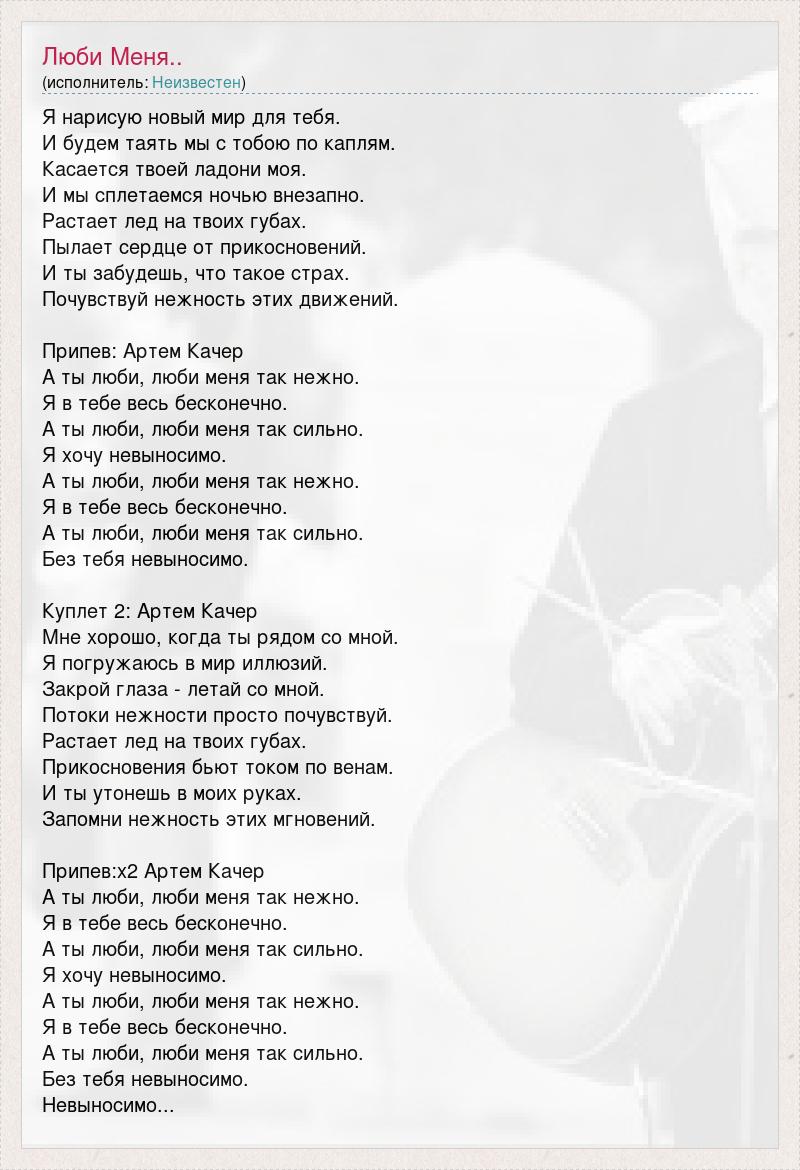 Я нарисую новый мир для тебя. И будем таять мы с тобою по каплям. Касается твоей ладони моя. И мы сплетаемся ночью внезапно. Растает лед на твоих губах. Пылает сердце от прикосновений. И ты забудешь, что такое страх. Почувствуй нежность этих движений. Припев: Артем Качер А ты люби, люби меня так нежно. Я в тебе весь бесконечно. А ты люби, люби меня так сильно. Я хочу невыносимо. А ты люби, люби меня так нежно. Я в тебе весь бесконечно. А ты люби, люби меня так сильно. Без тебя невыносимо. Куплет 2: Артем Качер Мне хорошо, когда ты рядом со мной. Я погружаюсь в мир иллюзий. Закрой глаза - летай со мной. Потоки нежности просто почувствуй. Растает лед на твоих губах. Прикосновения бьют током по венам. И ты утонешь в моих руках. Запомни нежность этих мгновений. Припев:х2 Артем Качер А ты люби, люби меня так нежно. Я в тебе весь бесконечно. А ты люби, люби меня так сильно. Я хочу невыносимо. А ты люби, люби меня так нежно. Я в тебе весь бесконечно. А ты люби, люби меня так сильно. Без тебя невыносимо. Невыносимо...