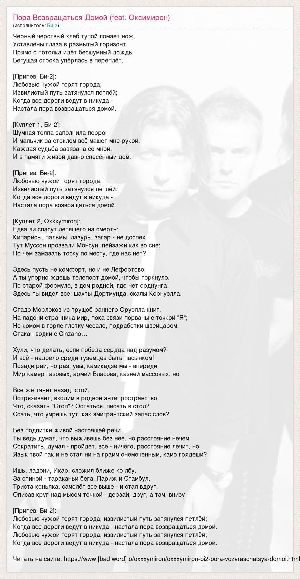 Чёрный чёрствый хлеб тупой ломает нож, Уставлены глаза в размытый горизонт. Прямо с потолка идёт бесшумный дождь, Бегущая строка упёрлась в переплёт. [Припев, Би-2]: Любовью чужой горят города, Извилистый путь затянулся петлёй; Когда все дороги ведут в никуда - Настала пора возвращаться домой. [Куплет 1, Би-2]: Шумная толпа заполнила перрон И мальчик за стеклом всё машет мне рукой. Каждая судьба завязана со мной, И в памяти живой давно снесённый дом. [Припев, Би-2]: Любовью чужой горят города, Извилистый путь затянулся петлёй; Когда все дороги ведут в никуда - Настала пора возвращаться домой. [Куплет 2, Oxxxymiron]: Едва ли спасут летящего на смерть: Кипарисы, пальмы, лазурь, загар - не доспех. Тут Муссон прозвали Монсун, пейзажи как во сне; Но чем замазать тоску по месту, где нас нет? Здесь пусть не комфорт, но и не Лефортово, А ты упорно ждешь телепорт домой, чтобы торкнуло. По старой формуле, в дом родной, где нет орднунга! Здесь ты видел все: шахты Дортмунда, скалы Корнуэлла. Стадо Морлоков из трущоб раннего Оруэлла книг. На ладони странника мир, пока связи порваны с точкой "Я"; Но комом в горле глотку чесало, подработки швейцаром. Стакан водки с Cinzano… Хули, что делать, если победа сердца над разумом? И всё - надоело среди туземцев быть пасынком! Позади рай, но раз, увы, камикадзе мы - впереди Мир камер газовых, армий Власова, казней массовых, но Все же тянет назад, стой, Потряхивает, входим в родное антипространство Что, сказать "Стоп"? Остаться, писать в стол? Ссать, что умрешь тут, как эмигрантский запас слов? Без подпитки живой настоящей речи Ты ведь думал, что выживешь без нее, но расстояние нечем Сократить, думал - пройдет, все - ничего, расстояние лечит, но Язык твой так и не стал ни на грамм онемеченным, камо грядеши? Ишь, ладони, Икар, сложил ближе ко лбу. За спиной - тараканьи бега, Париж и Стамбул. Триста коньяка, самолёт все выше - и стал вдруг, Описав круг над мысом точкой - дерзай, друг, а там, внизу - [Припев, Би-2]: Любовью чужой горят города, извилистый путь затянулся петлёй; Когда все дороги ведут в никуда - настала пора возвращаться домой. Любовью чужой горят города, извилистый путь затянулся петлёй; Когда все дороги ведут в никуда - настала пора возвращаться домой. Читать на сайте: https://www [bad word] o/oxxxymiron/oxxxymiron-bi2-pora-vozvraschatsya-domoi.html