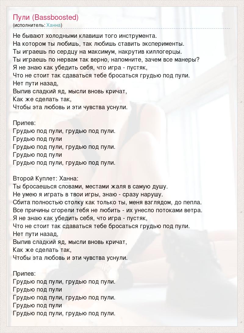 Не бывают холодными клавиши того инструмента. На котором ты любишь, так любишь ставить эксперименты. Ты играешь по сердцу на максимум, накрутив киллогерцы. Ты играешь по нервам так верно, напомните, зачем все манеры? Я не знаю как убедить себя, что игра - пустяк, Что не стоит так сдаваться тебе бросаться грудью под пули. Нет пути назад, Выпив сладкий яд, мысли вновь кричат, Как же сделать так, Чтобы эта любовь и эти чувства уснули. Припев: Грудью под пули, грудью под пули. Грудью под пули Грудью под пули, грудью под пули. Грудью под пули Грудью под пули, грудью под пули. Второй Куплет: Ханна: Ты бросаешься словами, местами жаля в самую душу. Не умею я играть в твои игры, знаю - сразу нарушу. Сбита полностью столку как только ты, меня взглядом, до пепла. Все причины сгорели тебя не любить - их унесло потоками ветра. Я не знаю как убедить себя, что игра - пустяк, Что не стоит так сдаваться тебе бросаться грудью под пули. Нет пути назад, Выпив сладкий яд, мысли вновь кричат, Как же сделать так, Чтобы эта любовь и эти чувства уснули. Припев: Грудью под пули, грудью под пули. Грудью под пули Грудью под пули, грудью под пули. Грудью под пули Грудью под пули, грудью под пули.