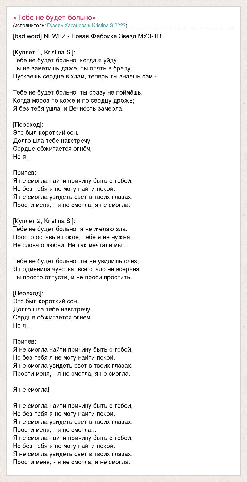 [bad word] NEWFZ - Новая Фабрика Звезд МУЗ-ТВ [Куплет 1, Kristina Si]: Тебе не будет больно, когда я уйду. Ты не заметишь даже, ты опять в бреду. Пускаешь сердце в хлам, теперь ты знаешь сам - Тебе не будет больно, ты сразу не поймёшь, Когда мороз по коже и по сердцу дрожь; Я без тебя ушла, и Вечность замерла. [Переход]: Это был короткий сон. Долго шла тебе навстречу Сердце обжигается огнём, Но я… Припев: Я не смогла найти причину быть с тобой, Но без тебя я не могу найти покой. Я не смогла увидеть свет в твоих глазах. Прости меня, - я не смогла, я не смогла. [Куплет 2, Kristina Si]: Тебе не будет больно, я не желаю зла. Просто оставь в покое, тебе я не нужна. Не слова о любви! Не так мечтали мы... Тебе не будет больно, ты не увидишь слёз; Я подменила чувства, все стало не всерьёз. Ты просто отпусти, и не проси простить... [Переход]: Это был короткий сон. Долго шла тебе навстречу Сердце обжигается огнём, Но я… Припев: Я не смогла найти причину быть с тобой, Но без тебя я не могу найти покой. Я не смогла увидеть свет в твоих глазах. Прости меня, - я не смогла, я не смогла. Я не смогла! Я не смогла найти причину быть с тобой, Но без тебя я не могу найти покой. Я не смогла увидеть свет в твоих глазах. Прости меня, - я не смогла... Я не смогла найти причину быть с тобой, Но без тебя я не могу найти покой. Я не смогла увидеть свет в твоих глазах. Прости меня, - я не смогла, я не смогла.