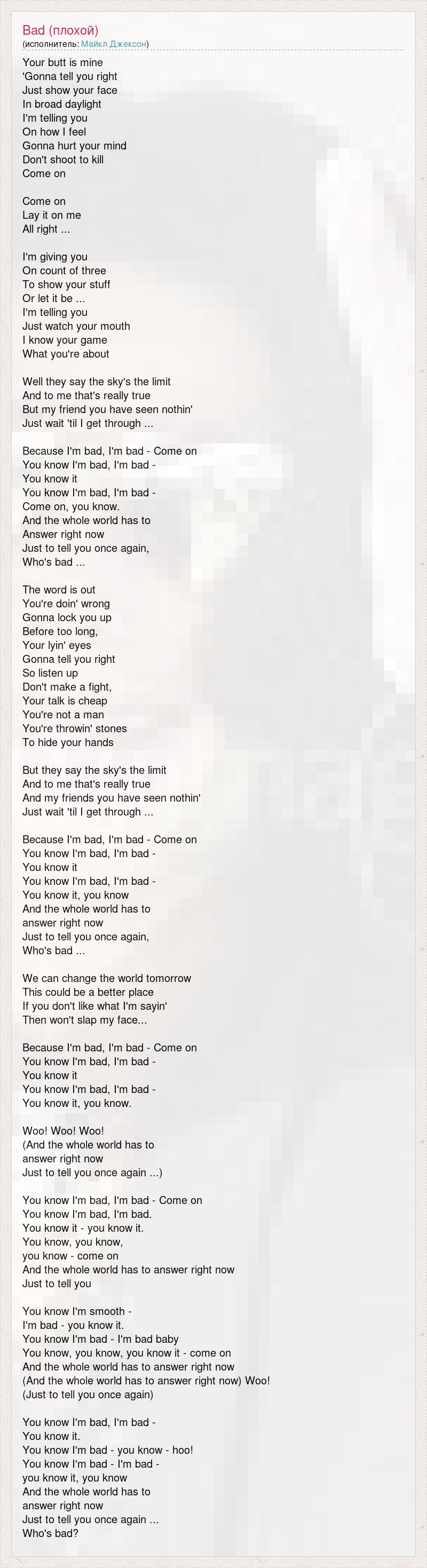 Your butt is mine 'Gonna tell you right Just show your face In broad daylight I'm telling you On how I feel Gonna hurt your mind Don't shoot to kill Come on Come on Lay it on me All right ... I'm giving you On count of three To show your stuff Or let it be ... I'm telling you Just watch your mouth I know your game What you're about Well they say the sky's the limit And to me that's really true But my friend you have seen nothin' Just wait 'til I get through ... Because I'm bad, I'm bad - Come on You know I'm bad, I'm bad - You know it You know I'm bad, I'm bad - Come on, you know. And the whole world has to Answer right now Just to tell you once again, Who's bad ... The word is out You're doin' wrong Gonna lock you up Before too long, Your lyin' eyes Gonna tell you right So listen up Don't make a fight, Your talk is cheap You're not a man You're throwin' stones To hide your hands But they say the sky's the limit And to me that's really true And my friends you have seen nothin' Just wait 'til I get through ... Because I'm bad, I'm bad - Come on You know I'm bad, I'm bad - You know it You know I'm bad, I'm bad - You know it, you know And the whole world has to answer right now Just to tell you once again, Who's bad ... We can change the world tomorrow This could be a better place If you don't like what I'm sayin' Then won't slap my face... Because I'm bad, I'm bad - Come on You know I'm bad, I'm bad - You know it You know I'm bad, I'm bad - You know it, you know. Woo! Woo! Woo! (And the whole world has to answer right now Just to tell you once again ...) You know I'm bad, I'm bad - Come on You know I'm bad, I'm bad. You know it - you know it. You know, you know, you know - come on And the whole world has to answer right now Just to tell you You know I'm smooth - I'm bad - you know it. You know I'm bad - I'm bad baby You know, you know, you know it - come on And the whole world has to answer right now (And the whole world has to answer right now) Woo! (Just to tell you once again) You know I'm bad, I'm bad - You know it. You know I'm bad - you know - hoo! You know I'm bad - I'm bad - you know it, you know And the whole world has to answer right now Just to tell you once again ... Who's bad?