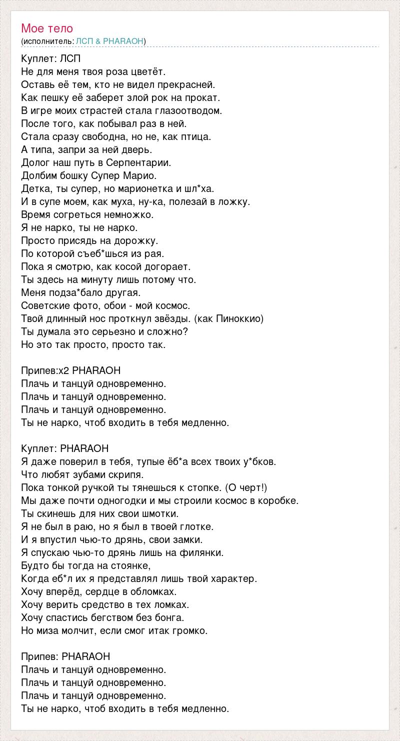 Куплет: ЛСП Не для меня твоя роза цветёт. Оставь её тем, кто не видел прекрасней. Как пешку её заберет злой рок на прокат. В игре моих страстей стала глазоотводом. После того, как побывал раз в ней. Стала сразу свободна, но не, как птица. А типа, запри за ней дверь. Долог наш путь в Серпентарии. Долбим бошку Супер Марио. Детка, ты супер, но марионетка и шл*ха. И в супе моем, как муха, ну-ка, полезай в ложку. Время согреться немножко. Я не нарко, ты не нарко. Просто присядь на дорожку. По которой съеб*шься из рая. Пока я смотрю, как косой догорает. Ты здесь на минуту лишь потому что. Меня подза*бало другая. Советские фото, обои - мой космос. Твой длинный нос проткнул звёзды. (как Пиноккио) Ты думала это серьезно и сложно? Но это так просто, просто так. Припев:х2 PHARAOH Плачь и танцуй одновременно. Плачь и танцуй одновременно. Плачь и танцуй одновременно. Ты не нарко, чтоб входить в тебя медленно. Куплет: PHARAOH Я даже поверил в тебя, тупые ёб*а всех твоих у*бков. Что любят зубами скрипя. Пока тонкой ручкой ты тянешься к стопке. (О черт!) Мы даже почти одногодки и мы строили космос в коробке. Ты скинешь для них свои шмотки. Я не был в раю, но я был в твоей глотке. И я впустил чью-то дрянь, свои замки. Я спускаю чью-то дрянь лишь на филянки. Будто бы тогда на стоянке, Когда еб*л их я представлял лишь твой характер. Хочу вперёд, сердце в обломках. Хочу верить средство в тех ломках. Хочу спастись бегством без бонга. Но миза молчит, если смог итак громко. Припев: PHARAOH Плачь и танцуй одновременно. Плачь и танцуй одновременно. Плачь и танцуй одновременно. Ты не нарко, чтоб входить в тебя медленно.