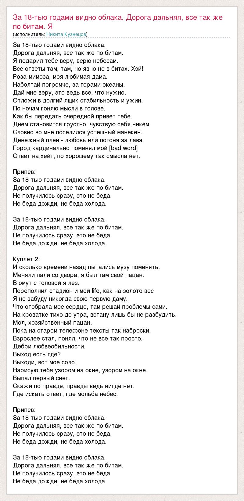 За 18-тью годами видно облака. Дорога дальняя, все так же по битам. Я подарил тебе веру, верю небесам. Все ответы там, там, но явно не в битах. Хэй! Роза-мимоза, моя любимая дама. Наболтай погромче, за горами океаны. Дай мне веру, это ведь все, что нужно. Отложи в долгий ящик стабильность и ужин. По ночам гоняю мысли в голове. Как бы передать очередной привет тебе. Днем становится грустно, чувствую себя никем. Словно во мне поселился успешный манекен. Денежный плен - любовь или погоня за лавэ. Город кардинально поменял мой [bad word] Ответ на хейт, по хорошему так смысла нет. Припев: За 18-тью годами видно облака. Дорога дальняя, все так же по битам. Не получилось сразу, это не беда. Не беда дожди, не беда холода. За 18-тью годами видно облака. Дорога дальняя, все так же по битам. Не получилось сразу, это не беда. Не беда дожди, не беда холода. Куплет 2: И сколько времени назад пытались музу поменять. Меняли пали со двора, я был там свой пацан. В омут с головой я лез. Переполнил стадион и мой life, как на золото вес Я не забуду никогда свою первую даму. Что отобрала мое сердце, там решай проблемы сами. На кроватке тихо до утра, встану лишь бы не разбудить. Мол, хозяйственный пацан. Пока на старом телефоне тексты так наброски. Взрослее стал, понял, что не все так просто. Дебри любвеобильности. Выход есть где? Выходи, вот мое соло. Нарисую тебя узором на окне, узором на окне. Выпал первый снег. Скажи по правде, правды ведь нигде нет. Где искать ответ, где мольба небес. Припев: За 18-тью годами видно облака. Дорога дальняя, все так же по битам. Не получилось сразу, это не беда. Не беда дожди, не беда холода. За 18-тью годами видно облака. Дорога дальняя, все так же по битам. Не получилось сразу, это не беда. Не беда дожди, не беда холода