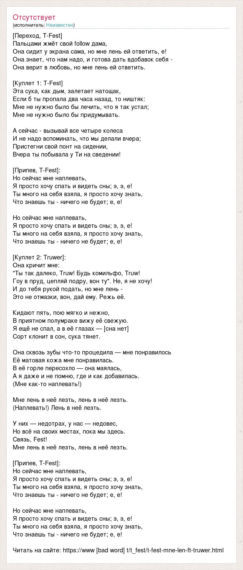 [Переход, T-Fest] Пальцами жмёт свой follow дама, Она сидит у экрана сама, но мне лень ей ответить, е! Она знает, что нам надо, и готова дать вдобавок себя - Она верит в любовь, но мне лень ей ответить. [Куплет 1: T-Fest] Эта сука, как дым, залетает натощак, Если б ты пропала два часа назад, то ништяк: Мне не нужно было бы лечить, что я так устал; Мне не нужно было бы придумывать. А сейчас - вызывай все четыре колеса И не надо вспоминать, что мы делали вчера; Пристегни свой понт на сидении, Вчера ты побывала у Ти на сведении! [Припев, T-Fest]: Но сейчас мне наплевать, Я просто хочу спать и видеть сны; э, э, е! Ты много на себя взяла, я просто хочу знать, Что знаешь ты - ничего не будет; е, е! Но сейчас мне наплевать, Я просто хочу спать и видеть сны; э, э, е! Ты много на себя взяла, я просто хочу знать, Что знаешь ты - ничего не будет; е, е! [Куплет 2: Truwer]: Она кричит мне: "Ты так далеко, Truw! Будь комильфо, Truw! Гоу в пруд, цепляй подру, вон ту". Не, я не хочу! И до тебя рукой подать, но мне лень - Это не отмазки, вон, дай ему. Режь её. Кидают пять, пою мягко и нежно, В приятном полумраке вижу её свежую. Я ещё не спал, а в её глазах — [сна нет] Сорт клонит в сон, сука тянет. Она сквозь зубы что-то процедила — мне понравилось Её матовая кожа мне понравилась. В её горле пересохло — она маялась, А я даже и не помню, где и как добавилась. (Мне как-то наплевать!) Мне лень в неё лезть, лень в неё лезть. (Наплевать!) Лень в неё лезть. У них — недотрах, у нас — недовес, Но всё на своих местах, пока мы здесь. Связь, Fest! Мне лень в неё лезть, лень в неё лезть. [Припев, T-Fest]: Но сейчас мне наплевать, Я просто хочу спать и видеть сны; э, э, е! Ты много на себя взяла, я просто хочу знать, Что знаешь ты - ничего не будет; е, е! Но сейчас мне наплевать, Я просто хочу спать и видеть сны; э, э, е! Ты много на себя взяла, я просто хочу знать, Что знаешь ты - ничего не будет; е, е! Читать на сайте: https://www [bad word] t/t_fest/t-fest-mne-len-ft-truwer.html