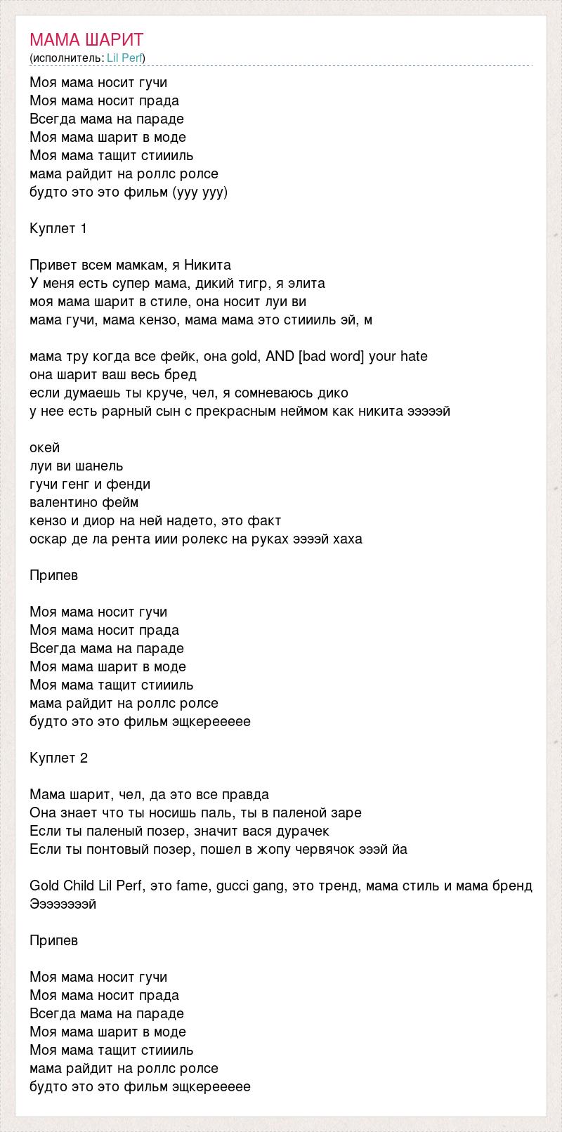 Моя мама носит гучи Моя мама носит прада Всегда мама на параде Моя мама шарит в моде Моя мама тащит стиииль мама райдит на роллс ролсе будто это это фильм (ууу ууу) Куплет 1 Привет всем мамкам, я Никита У меня есть супер мама, дикий тигр, я элита моя мама шарит в стиле, она носит луи ви мама гучи, мама кензо, мама мама это стиииль эй, м мама тру когда все фейк, она gold, AND [bad word] your hate она шарит ваш весь бред если думаешь ты круче, чел, я сомневаюсь дико у нее есть рарный сын с прекрасным неймом как никита эээээй окей луи ви шанель гучи генг и фенди валентино фейм кензо и диор на ней надето, это факт оскар де ла рента иии ролекс на руках ээээй хаха Припев Моя мама носит гучи Моя мама носит прада Всегда мама на параде Моя мама шарит в моде Моя мама тащит стиииль мама райдит на роллс ролсе будто это это фильм эщкереееее Куплет 2 Мама шарит, чел, да это все правда Она знает что ты носишь паль, ты в паленой заре Если ты паленый позер, значит вася дурачек Если ты понтовый позер, пошел в жопу червячок эээй йа Gold Child Lil Perf, это fame, gucci gang, это тренд, мама стиль и мама бренд Ээээээээй Припев Моя мама носит гучи Моя мама носит прада Всегда мама на параде Моя мама шарит в моде Моя мама тащит стиииль мама райдит на роллс ролсе будто это это фильм эщкереееее