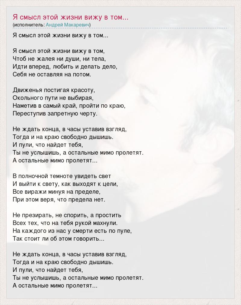 Я смысл этой жизни вижу в том... Я смысл этой жизни вижу в том, Чтоб не жалея ни души, ни тела, Идти вперед, любить и делать дело, Себя не оставляя на потом. Движенья постигая красоту, Окольного пути не выбирая, Наметив в самый край, пройти по краю, Переступив запретную черту. Не ждать конца, в часы уставив взгляд, Тогда и на краю свободно дышишь. И пули, что найдет тебя, Ты не услышишь, а остальные мимо пролетят. А остальные мимо пролетят... В полночной темноте увидеть свет И выйти к свету, как выходят к цели, Все виражи минуя на пределе, При этом веря, что предела нет. Не презирать, не спорить, а простить Всех тех, что на тебя рукой махнули. На каждого из нас у смерти есть по пуле, Так стоит ли об этом говорить... Не ждать конца, в часы уставив взгляд, Тогда и на краю свободно дышишь. И пули, что найдет тебя, Ты не услышишь, а остальные мимо пролетят. А остальные мимо пролетят...