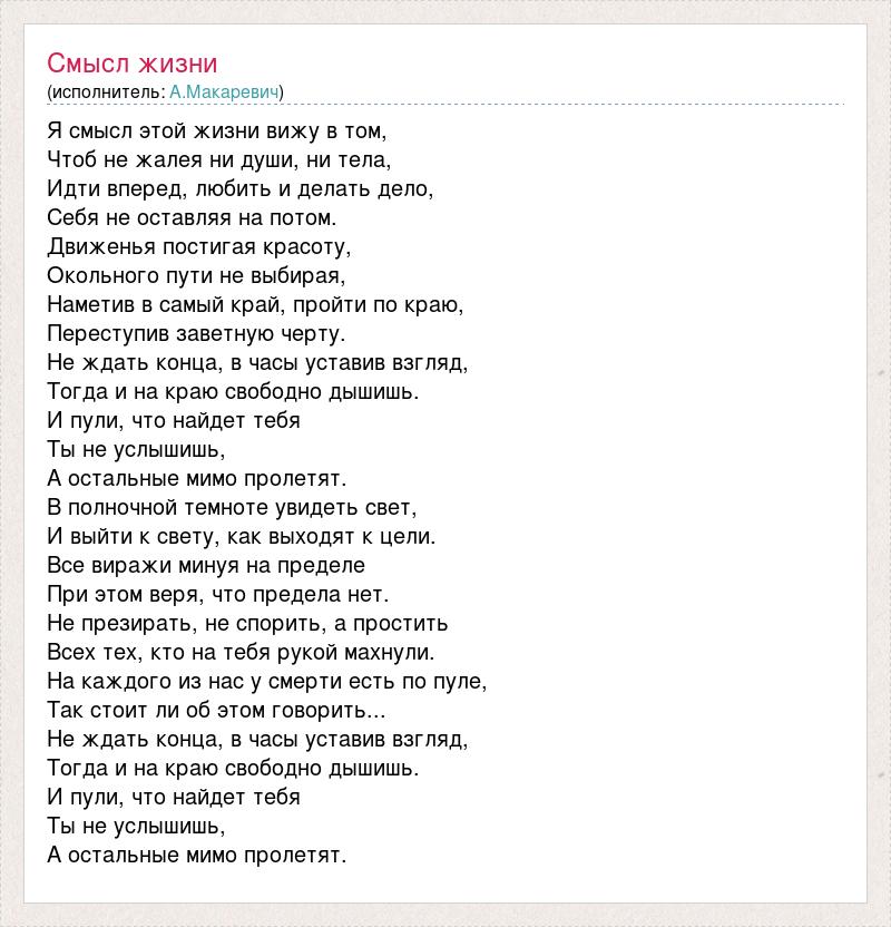 Я смысл этой жизни вижу в том, Чтоб не жалея ни души, ни тела, Идти вперед, любить и делать дело, Себя не оставляя на потом. Движенья постигая красоту, Окольного пути не выбирая, Наметив в самый край, пройти по краю, Переступив заветную черту. Не ждать конца, в часы уставив взгляд, Тогда и на краю свободно дышишь. И пули, что найдет тебя Ты не услышишь, А остальные мимо пролетят. В полночной темноте увидеть свет, И выйти к свету, как выходят к цели. Все виражи минуя на пределе При этом веря, что предела нет. Не презирать, не спорить, а простить Всех тех, кто на тебя рукой махнули. На каждого из нас у смерти есть по пуле, Так стоит ли об этом говорить... Не ждать конца, в часы уставив взгляд, Тогда и на краю свободно дышишь. И пули, что найдет тебя Ты не услышишь, А остальные мимо пролетят.