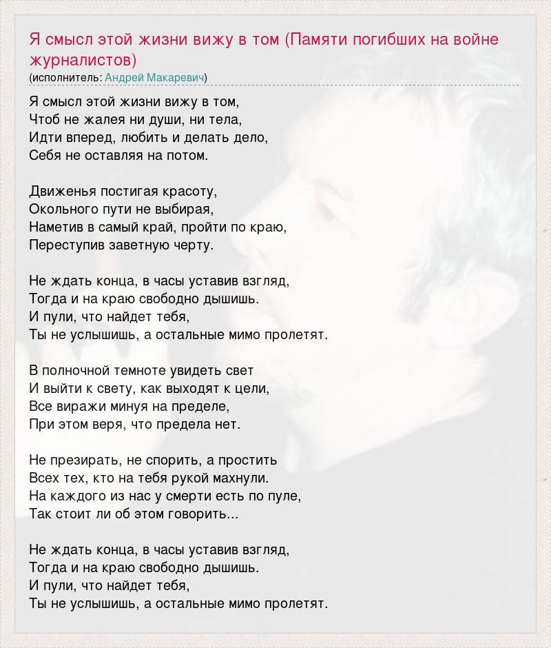 Я смысл этой жизни вижу в том, Чтоб не жалея ни души, ни тела, Идти вперед, любить и делать дело, Себя не оставляя на потом. Движенья постигая красоту, Окольного пути не выбирая, Наметив в самый край, пройти по краю, Переступив заветную черту. Не ждать конца, в часы уставив взгляд, Тогда и на краю свободно дышишь. И пули, что найдет тебя, Ты не услышишь, а остальные мимо пролетят. В полночной темноте увидеть свет И выйти к свету, как выходят к цели, Все виражи минуя на пределе, При этом веря, что предела нет. Не презирать, не спорить, а простить Всех тех, кто на тебя рукой махнули. На каждого из нас у смерти есть по пуле, Так стоит ли об этом говорить... Не ждать конца, в часы уставив взгляд, Тогда и на краю свободно дышишь. И пули, что найдет тебя, Ты не услышишь, а остальные мимо пролетят.