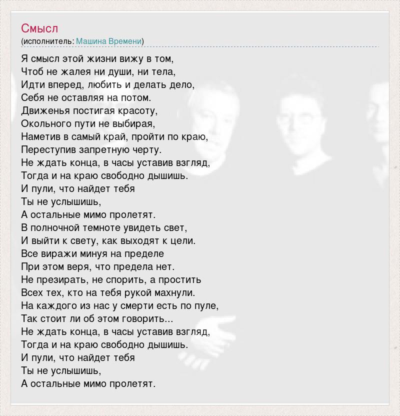 Я смысл этой жизни вижу в том, Чтоб не жалея ни души, ни тела, Идти вперед, любить и делать дело, Себя не оставляя на потом. Движенья постигая красоту, Окольного пути не выбирая, Наметив в самый край, пройти по краю, Переступив запретную черту. Не ждать конца, в часы уставив взгляд, Тогда и на краю свободно дышишь. И пули, что найдет тебя Ты не услышишь, А остальные мимо пролетят. В полночной темноте увидеть свет, И выйти к свету, как выходят к цели. Все виражи минуя на пределе При этом веря, что предела нет. Не презирать, не спорить, а простить Всех тех, кто на тебя рукой махнули. На каждого из нас у смерти есть по пуле, Так стоит ли об этом говорить... Не ждать конца, в часы уставив взгляд, Тогда и на краю свободно дышишь. И пули, что найдет тебя Ты не услышишь, А остальные мимо пролетят.