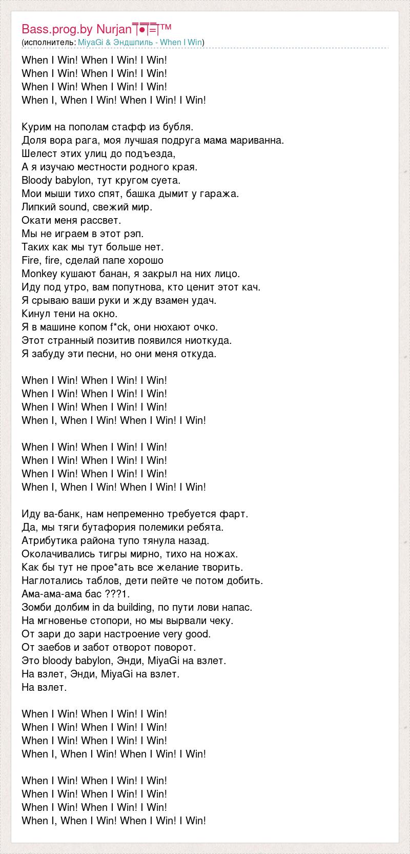 When I Win! When I Win! I Win! When I Win! When I Win! I Win! When I Win! When I Win! I Win! When I, When I Win! When I Win! I Win! Курим на пополам стафф из бубля. Доля вора рага, моя лучшая подруга мама мариванна. Шелест этих улиц до подъезда, А я изучаю местности родного края. Bloody babylon, тут кругом суета. Мои мыши тихо спят, башка дымит у гаража. Липкий sound, свежий мир. Окати меня рассвет. Мы не играем в этот рэп. Таких как мы тут больше нет. Fire, fire, сделай папе хорошо Monkey кушают банан, я закрыл на них лицо. Иду под утро, вам попутнова, кто ценит этот кач. Я срываю ваши руки и жду взамен удач. Кинул тени на окно. Я в машине копом f*ck, они нюхают очко. Этот странный позитив появился ниоткуда. Я забуду эти песни, но они меня откуда. When I Win! When I Win! I Win! When I Win! When I Win! I Win! When I Win! When I Win! I Win! When I, When I Win! When I Win! I Win! When I Win! When I Win! I Win! When I Win! When I Win! I Win! When I Win! When I Win! I Win! When I, When I Win! When I Win! I Win! Иду ва-банк, нам непременно требуется фарт. Да, мы тяги бутафория полемики ребята. Атрибутика района тупо тянула назад. Околачивались тигры мирно, тихо на ножах. Как бы тут не прое*ать все желание творить. Наглотались таблов, дети пейте че потом добить. Ама-ама-ама бас ???1. Зомби долбим in da building, по пути лови напас. На мгновенье стопори, но мы вырвали чеку. От зари до зари настроение very good. От заебов и забот отворот поворот. Это bloody babylon, Энди, MiyaGi на взлет. На взлет, Энди, MiyaGi на взлет. На взлет. When I Win! When I Win! I Win! When I Win! When I Win! I Win! When I Win! When I Win! I Win! When I, When I Win! When I Win! I Win! When I Win! When I Win! I Win! When I Win! When I Win! I Win! When I Win! When I Win! I Win! When I, When I Win! When I Win! I Win!