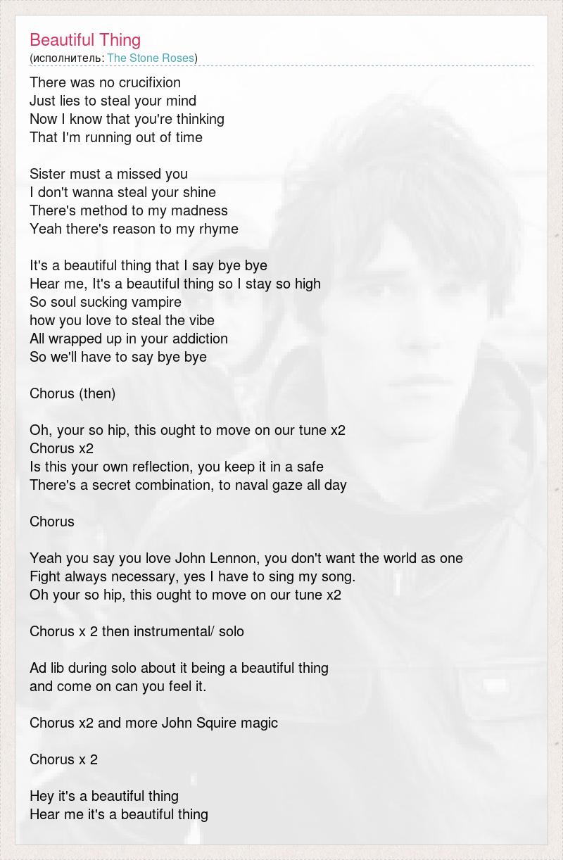 There was no crucifixion Just lies to steal your mind Now I know that you're thinking That I'm running out of time Sister must a missed you I don't wanna steal your shine There's method to my madness Yeah there's reason to my rhyme It's a beautiful thing that I say bye bye Hear me, It's a beautiful thing so I stay so high So soul sucking vampire how you love to steal the vibe All wrapped up in your addiction So we'll have to say bye bye Chorus (then) Oh, your so hip, this ought to move on our tune x2 Chorus x2 Is this your own reflection, you keep it in a safe There's a secret combination, to naval gaze all day Chorus Yeah you say you love John Lennon, you don't want the world as one Fight always necessary, yes I have to sing my song. Oh your so hip, this ought to move on our tune x2 Chorus x 2 then instrumental/ solo Ad lib during solo about it being a beautiful thing and come on can you feel it. Chorus x2 and more John Squire magic Chorus x 2 Hey it's a beautiful thing Hear me it's a beautiful thing