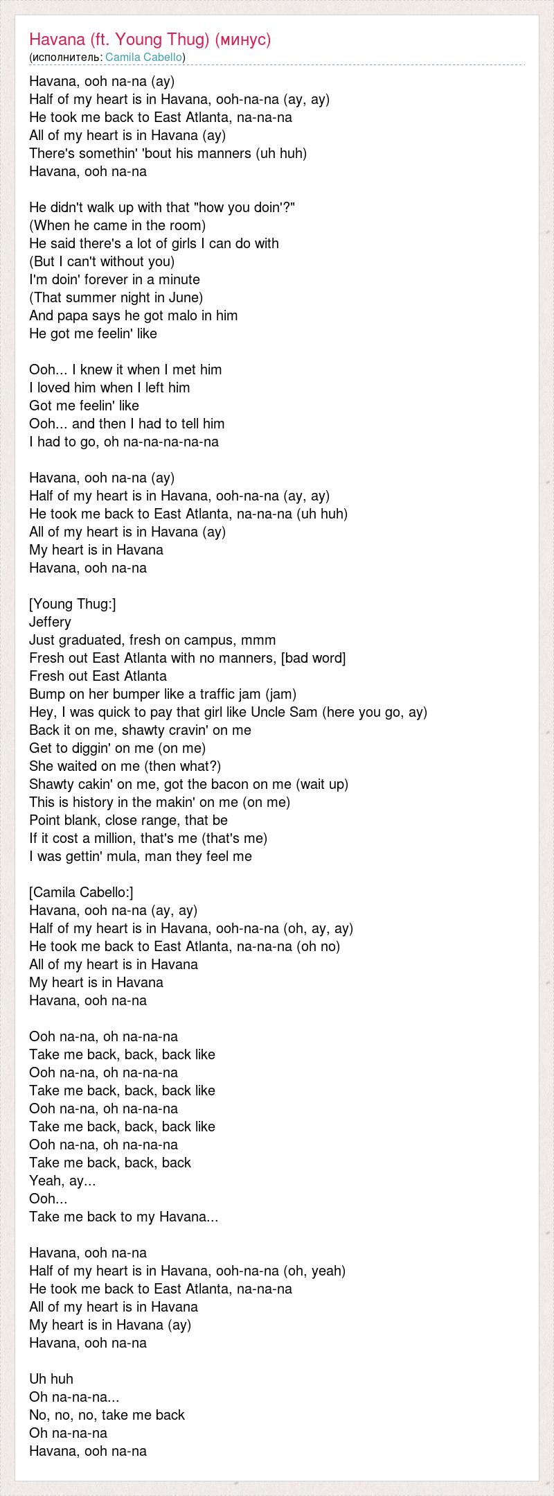 Havana, ooh na-na (ay) Half of my heart is in Havana, ooh-na-na (ay, ay) He took me back to East Atlanta, na-na-na All of my heart is in Havana (ay) There's somethin' 'bout his manners (uh huh) Havana, ooh na-na He didn't walk up with that "how you doin'?" (When he came in the room) He said there's a lot of girls I can do with (But I can't without you) I'm doin' forever in a minute (That summer night in June) And papa says he got malo in him He got me feelin' like Ooh... I knew it when I met him I loved him when I left him Got me feelin' like Ooh... and then I had to tell him I had to go, oh na-na-na-na-na Havana, ooh na-na (ay) Half of my heart is in Havana, ooh-na-na (ay, ay) He took me back to East Atlanta, na-na-na (uh huh) All of my heart is in Havana (ay) My heart is in Havana Havana, ooh na-na [Young Thug:] Jeffery Just graduated, fresh on campus, mmm Fresh out East Atlanta with no manners, [bad word] Fresh out East Atlanta Bump on her bumper like a traffic jam (jam) Hey, I was quick to pay that girl like Uncle Sam (here you go, ay) Back it on me, shawty cravin' on me Get to diggin' on me (on me) She waited on me (then what?) Shawty cakin' on me, got the bacon on me (wait up) This is history in the makin' on me (on me) Point blank, close range, that be If it cost a million, that's me (that's me) I was gettin' mula, man they feel me [Camila Cabello:] Havana, ooh na-na (ay, ay) Half of my heart is in Havana, ooh-na-na (oh, ay, ay) He took me back to East Atlanta, na-na-na (oh no) All of my heart is in Havana My heart is in Havana Havana, ooh na-na Ooh na-na, oh na-na-na Take me back, back, back like Ooh na-na, oh na-na-na Take me back, back, back like Ooh na-na, oh na-na-na Take me back, back, back like Ooh na-na, oh na-na-na Take me back, back, back Yeah, ay... Ooh... Take me back to my Havana... Havana, ooh na-na Half of my heart is in Havana, ooh-na-na (oh, yeah) He took me back to East Atlanta, na-na-na All of my heart is in Havana My heart is in Havana (ay) Havana, ooh na-na Uh huh Oh na-na-na... No, no, no, take me back Oh na-na-na Havana, ooh na-na