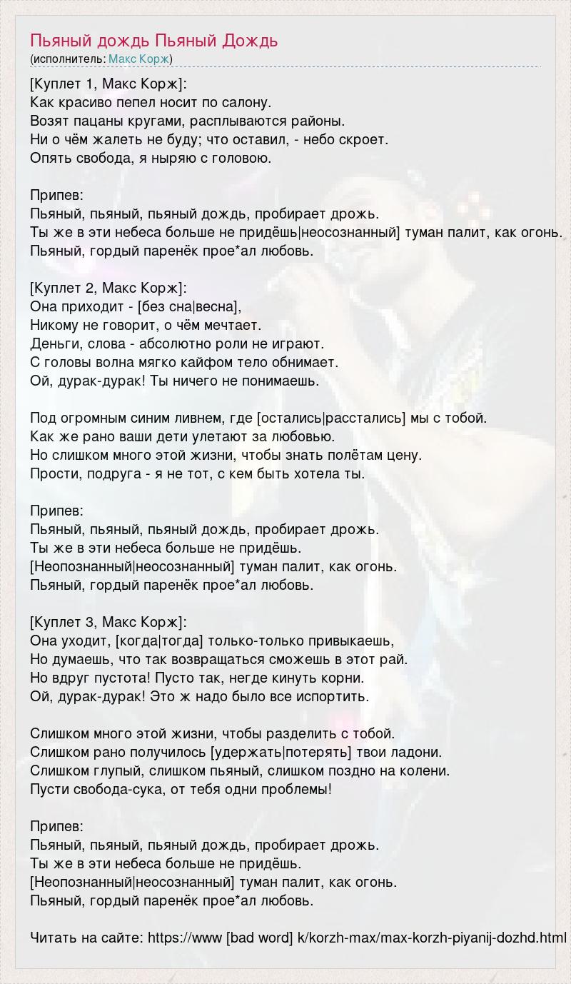 [Куплет 1, Макс Корж]: Как красиво пепел носит по салону. Возят пацаны кругами, расплываются районы. Ни о чём жалеть не буду; что оставил, - небо скроет. Опять свобода, я ныряю с головою. Припев: Пьяный, пьяный, пьяный дождь, пробирает дрожь. Ты же в эти небеса больше не придёшь|неосознанный] туман палит, как огонь. Пьяный, гордый паренёк прое*ал любовь. [Куплет 2, Макс Корж]: Она приходит - [без сна|весна], Никому не говорит, о чём мечтает. Деньги, слова - абсолютно роли не играют. С головы волна мягко кайфом тело обнимает. Ой, дурак-дурак! Ты ничего не понимаешь. Под огромным синим ливнем, где [остались|расстались] мы с тобой. Как же рано ваши дети улетают за любовью. Но слишком много этой жизни, чтобы знать полётам цену. Прости, подруга - я не тот, с кем быть хотела ты. Припев: Пьяный, пьяный, пьяный дождь, пробирает дрожь. Ты же в эти небеса больше не придёшь. [Неопознанный|неосознанный] туман палит, как огонь. Пьяный, гордый паренёк прое*ал любовь. [Куплет 3, Макс Корж]: Она уходит, [когда|тогда] только-только привыкаешь, Но думаешь, что так возвращаться сможешь в этот рай. Но вдруг пустота! Пусто так, негде кинуть корни. Ой, дурак-дурак! Это ж надо было все испортить. Слишком много этой жизни, чтобы разделить с тобой. Слишком рано получилось [удержать|потерять] твои ладони. Слишком глупый, слишком пьяный, слишком поздно на колени. Пусти свобода-сука, от тебя одни проблемы! Припев: Пьяный, пьяный, пьяный дождь, пробирает дрожь. Ты же в эти небеса больше не придёшь. [Неопознанный|неосознанный] туман палит, как огонь. Пьяный, гордый паренёк прое*ал любовь. Читать на сайте: https://www [bad word] k/korzh-max/max-korzh-piyanij-dozhd.html