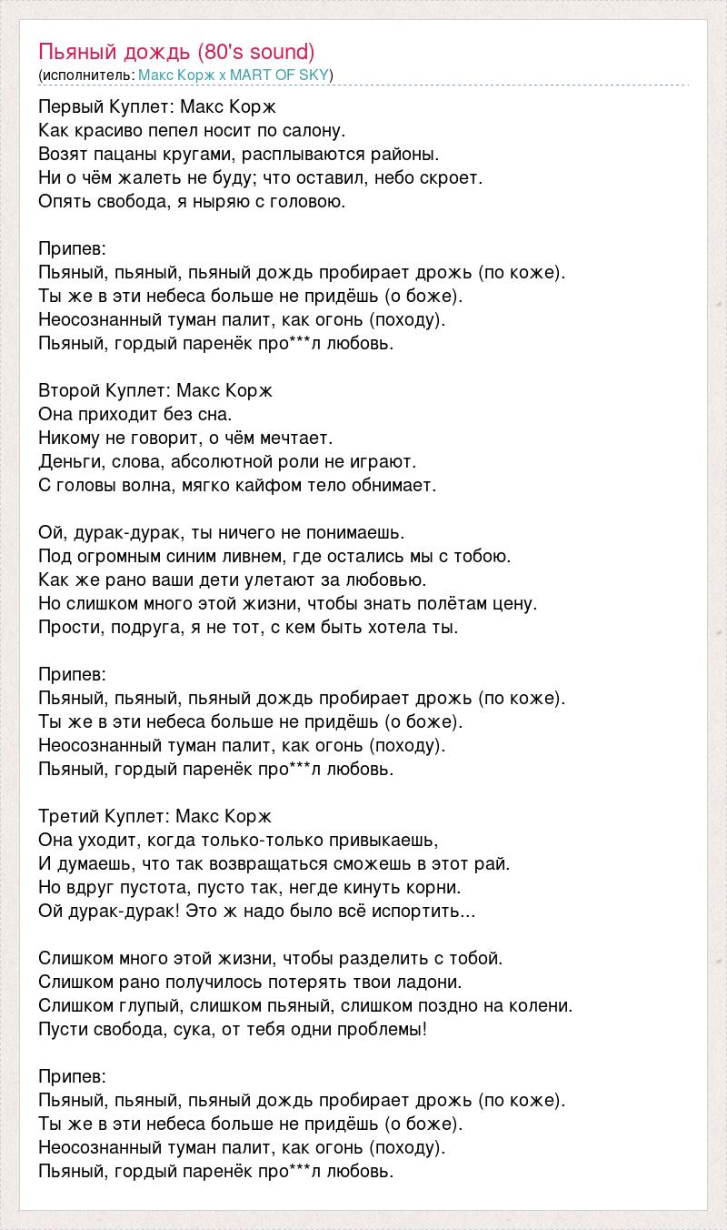Первый Куплет: Макс Корж Как красиво пепел носит по салону. Возят пацаны кругами, расплываются районы. Ни о чём жалеть не буду; что оставил, небо скроет. Опять свобода, я ныряю с головою. Припев: Пьяный, пьяный, пьяный дождь пробирает дрожь (по коже). Ты же в эти небеса больше не придёшь (о боже). Неосознанный туман палит, как огонь (походу). Пьяный, гордый паренёк про***л любовь. Второй Куплет: Макс Корж Она приходит без сна. Никому не говорит, о чём мечтает. Деньги, слова, абсолютной роли не играют. С головы волна, мягко кайфом тело обнимает. Ой, дурак-дурак, ты ничего не понимаешь. Под огромным синим ливнем, где остались мы с тобою. Как же рано ваши дети улетают за любовью. Но слишком много этой жизни, чтобы знать полётам цену. Прости, подруга, я не тот, с кем быть хотела ты. Припев: Пьяный, пьяный, пьяный дождь пробирает дрожь (по коже). Ты же в эти небеса больше не придёшь (о боже). Неосознанный туман палит, как огонь (походу). Пьяный, гордый паренёк про***л любовь. Третий Куплет: Макс Корж Она уходит, когда только-только привыкаешь, И думаешь, что так возвращаться сможешь в этот рай. Но вдруг пустота, пусто так, негде кинуть корни. Ой дурак-дурак! Это ж надо было всё испортить... Слишком много этой жизни, чтобы разделить с тобой. Слишком рано получилось потерять твои ладони. Слишком глупый, слишком пьяный, слишком поздно на колени. Пусти свобода, сука, от тебя одни проблемы! Припев: Пьяный, пьяный, пьяный дождь пробирает дрожь (по коже). Ты же в эти небеса больше не придёшь (о боже). Неосознанный туман палит, как огонь (походу). Пьяный, гордый паренёк про***л любовь.