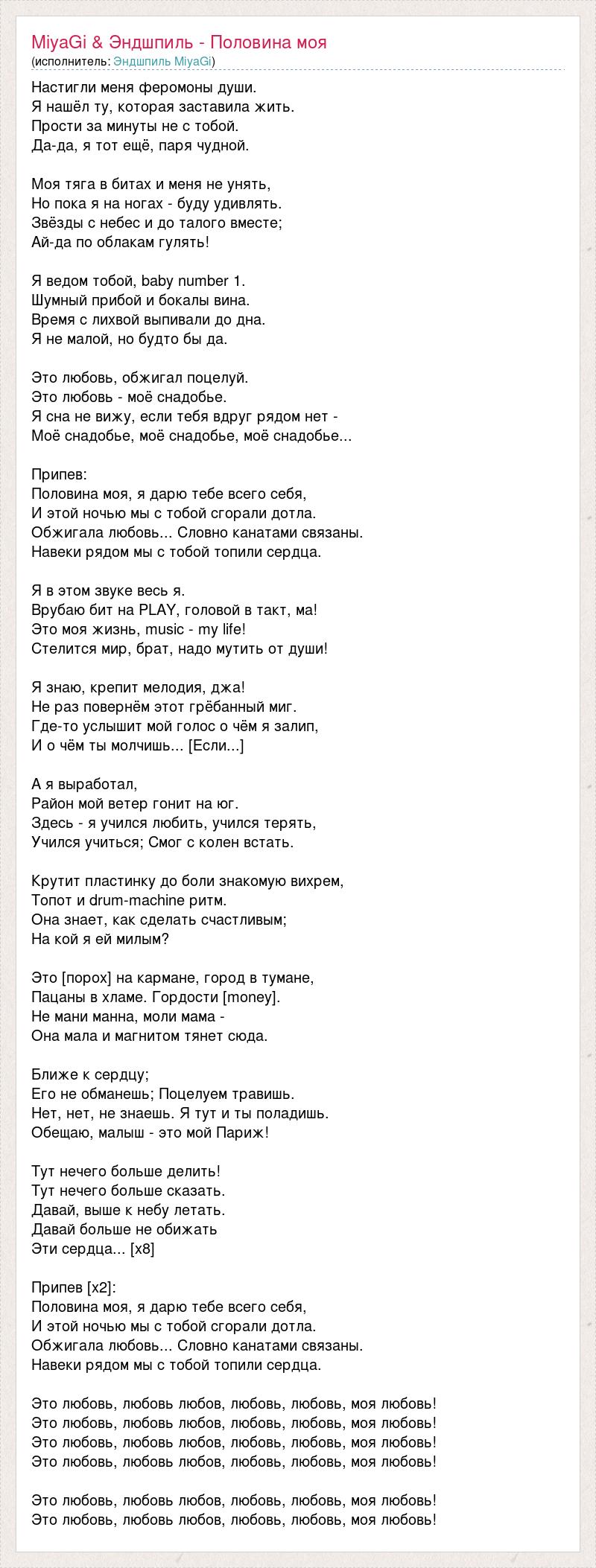 Настигли меня феромоны души. Я нашёл ту, которая заставила жить. Прости за минуты не с тобой. Да-да, я тот ещё, паря чудной. Моя тяга в битах и меня не унять, Но пока я на ногах - буду удивлять. Звёзды с небес и до талого вместе; Ай-да по облакам гулять! Я ведом тобой, baby number 1. Шумный прибой и бокалы вина. Время с лихвой выпивали до дна. Я не малой, но будто бы да. Это любовь, обжигал поцелуй. Это любовь - моё снадобье. Я сна не вижу, если тебя вдруг рядом нет - Моё снадобье, моё снадобье, моё снадобье... Припев: Половина моя, я дарю тебе всего себя, И этой ночью мы с тобой сгорали дотла. Обжигала любовь... Словно канатами связаны. Навеки рядом мы с тобой топили сердца. Я в этом звуке весь я. Врубаю бит на PLAY, головой в такт, ма! Это моя жизнь, music - my life! Стелится мир, брат, надо мутить от души! Я знаю, крепит мелодия, джа! Не раз повернём этот грёбанный миг. Где-то услышит мой голос о чём я залип, И о чём ты молчишь... [Если...] А я выработал, Район мой ветер гонит на юг. Здесь - я учился любить, учился терять, Учился учиться; Смог с колен встать. Крутит пластинку до боли знакомую вихрем, Топот и drum-machine ритм. Она знает, как сделать счастливым; На кой я ей милым? Это [порох] на кармане, город в тумане, Пацаны в хламе. Гордости [money]. Не мани манна, моли мама - Она мала и магнитом тянет сюда. Ближе к сердцу; Его не обманешь; Поцелуем травишь. Нет, нет, не знаешь. Я тут и ты поладишь. Обещаю, малыш - это мой Париж! Тут нечего больше делить! Тут нечего больше сказать. Давай, выше к небу летать. Давай больше не обижать Эти сердца... [x8] Припев [x2]: Половина моя, я дарю тебе всего себя, И этой ночью мы с тобой сгорали дотла. Обжигала любовь... Словно канатами связаны. Навеки рядом мы с тобой топили сердца. Это любовь, любовь любов, любовь, любовь, моя любовь! Это любовь, любовь любов, любовь, любовь, моя любовь! Это любовь, любовь любов, любовь, любовь, моя любовь! Это любовь, любовь любов, любовь, любовь, моя любовь! Это любовь, любовь любов, любовь, любовь, моя любовь! Это любовь, любовь любов, любовь, любовь, моя любовь!