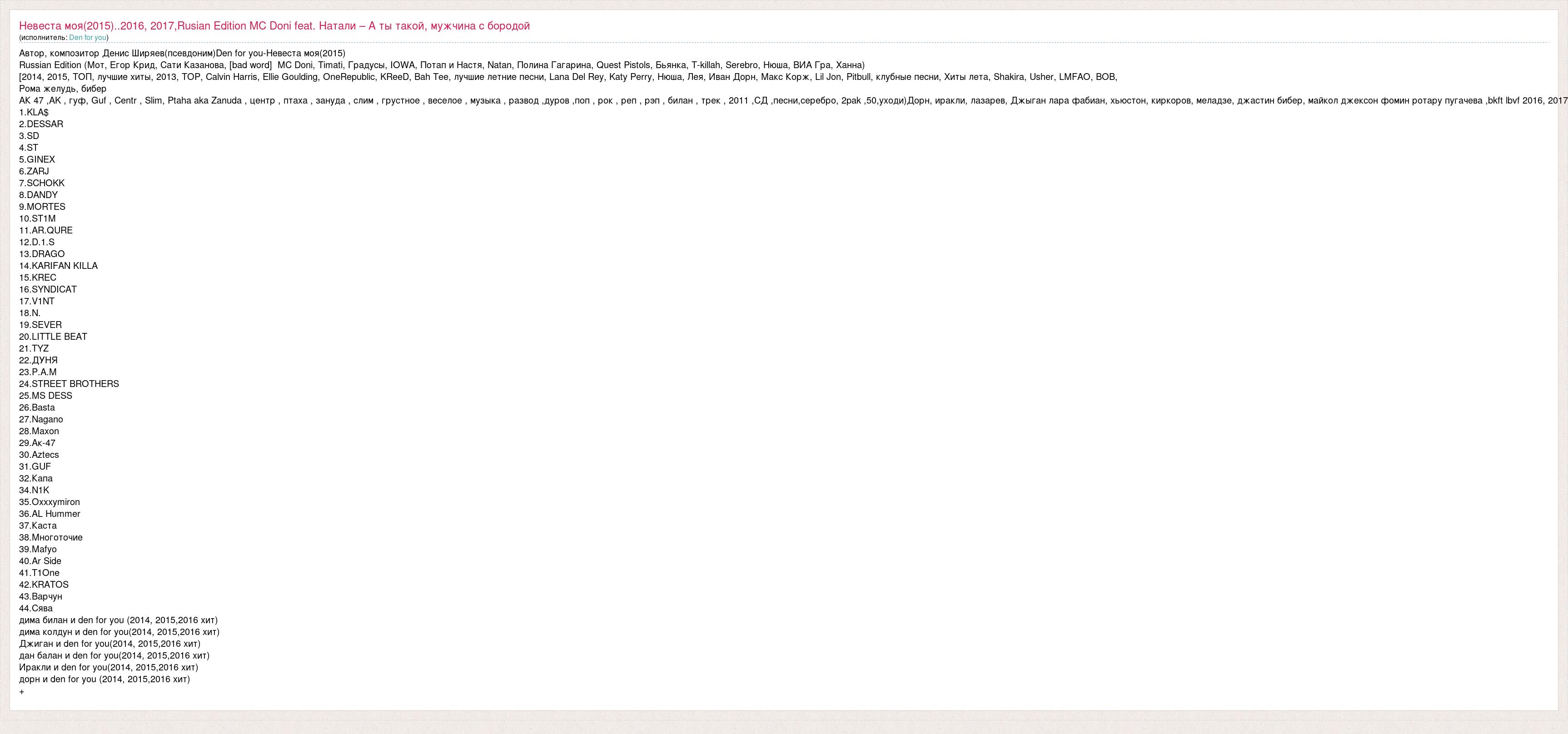 Автор, композитор Денис Ширяев(псевдоним)Den for you-Невеста моя(2015) Russian Edition (Мот, Егор Крид, Сати Казанова, [bad word] MC Doni, Timati, Градусы, IOWA, Потап и Настя, Natan, Полина Гагарина, Quest Pistols, Бьянка, T-killah, Serebro, Нюша, ВИА Гра, Ханна) [2014, 2015, ТОП, лучшие хиты, 2013, TOP, Calvin Harris, Ellie Goulding, OneRepublic, KReeD, Bah Tee, лучшие летние песни, Lana Del Rey, Katy Perry, Нюша, Лея, Иван Дорн, Макс Корж, Lil Jon, Pitbull, клубные песни, Хиты лета, Shakira, Usher, LMFAO, BOB, Рома желудь, бибер АК 47 ,AK , гуф, Guf , Centr , Slim, Ptaha aka Zanuda , центр , птаха , зануда , слим , грустное , веселое , музыка , развод ,дуров ,поп , рок , реп , рэп , билан , трек , 2011 ,СД ,песни,серебро, 2pak ,50,уходи)Дорн, иракли, лазарев, Джыган лара фабиан, хьюстон, киркоров, меладзе, джастин бибер, майкол джексон фомин ротару пугачева ,bkft lbvf 2016, 2017 1.KLA$ 2.DESSAR 3.SD 4.ST 5.GINEX 6.ZARJ 7.SCHOKK 8.DANDY 9.MORTES 10.ST1M 11.AR.QURE 12.D.1.S 13.DRAGO 14.KARIFAN KILLA 15.KREC 16.SYNDICAT 17.V1NT 18.N. 19.SEVER 20.LITTLE BEAT 21.TYZ 22.ДУНЯ 23.P.A.M 24.STREET BROTHERS 25.MS DESS 26.Basta 27.Nagano 28.Maxon 29.Ак-47 30.Aztecs 31.GUF 32.Капа 34.N1K 35.Oxxxymiron 36.AL Hummer 37.Каста 38.Многоточие 39.Mafyo 40.Ar Side 41.T1One 42.KRATOS 43.Варчун 44.Сява дима билан и den for you (2014, 2015,2016 хит) дима колдун и den for you(2014, 2015,2016 хит) Джиган и den for you(2014, 2015,2016 хит) дан балан и den for you(2014, 2015,2016 хит) Иракли и den for you(2014, 2015,2016 хит) дорн и den for you (2014, 2015,2016 хит) +