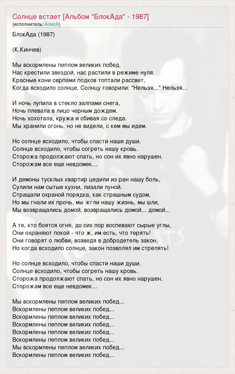 БлокАда (1987) (К.Кинчев) Мы вскормлены пеплом великих побед. Нас крестили звездой, нас растили в режиме нуля. Красные кони серпами подков топтали рассвет, Когда всходило солнце, Солнцу говорили: "Нельзя..." Нельзя... И ночь лупила в стекло залпами снега, Ночь плевала в лицо черным дождем. Ночь хохотала, кружа и сбивая со следа. Мы хранили огонь, но не видели, с кем мы идем. Но солнце всходило, чтобы спасти наши души. Солнце всходило, чтобы согреть нашу кровь. Сторожа продолжают спать, но сон их явно нарушен. Сторожам все еще невдомек... И демоны тусклых квартир цедили из ран нашу боль, Сулили нам сытые кухни, лизали луной. Стращали охраной порядка, как страшным судом, Но мы гнали их прочь, мы жгли нашу жизнь, мы шли, Мы возвращались домой, возвращались домой... домой... А те, кто боятся огня, до сих пор воспевают сырые углы, Они охраняют покой - что ж, им есть, что терять! Они говорят о любви, возведя в добродетель закон, Но когда всходило солнце, закон позволял им стрелять! Но солнце всходило, чтобы спасти наши души. Солнце всходило, чтобы согреть нашу кровь. Сторожа продолжают спать, но сон их явно нарушен. Сторожам все еще невдомек... Мы вскормлены пеплом великих побед... Вскормлены пеплом великих побед... Вскормлены пеплом великих побед... Вскормлены пеплом великих побед... Вскормлены пеплом великих побед... Вскормлены пеплом великих побед... Мы вскормлены пеплом великих побед... Вскормлены пеплом великих побед...