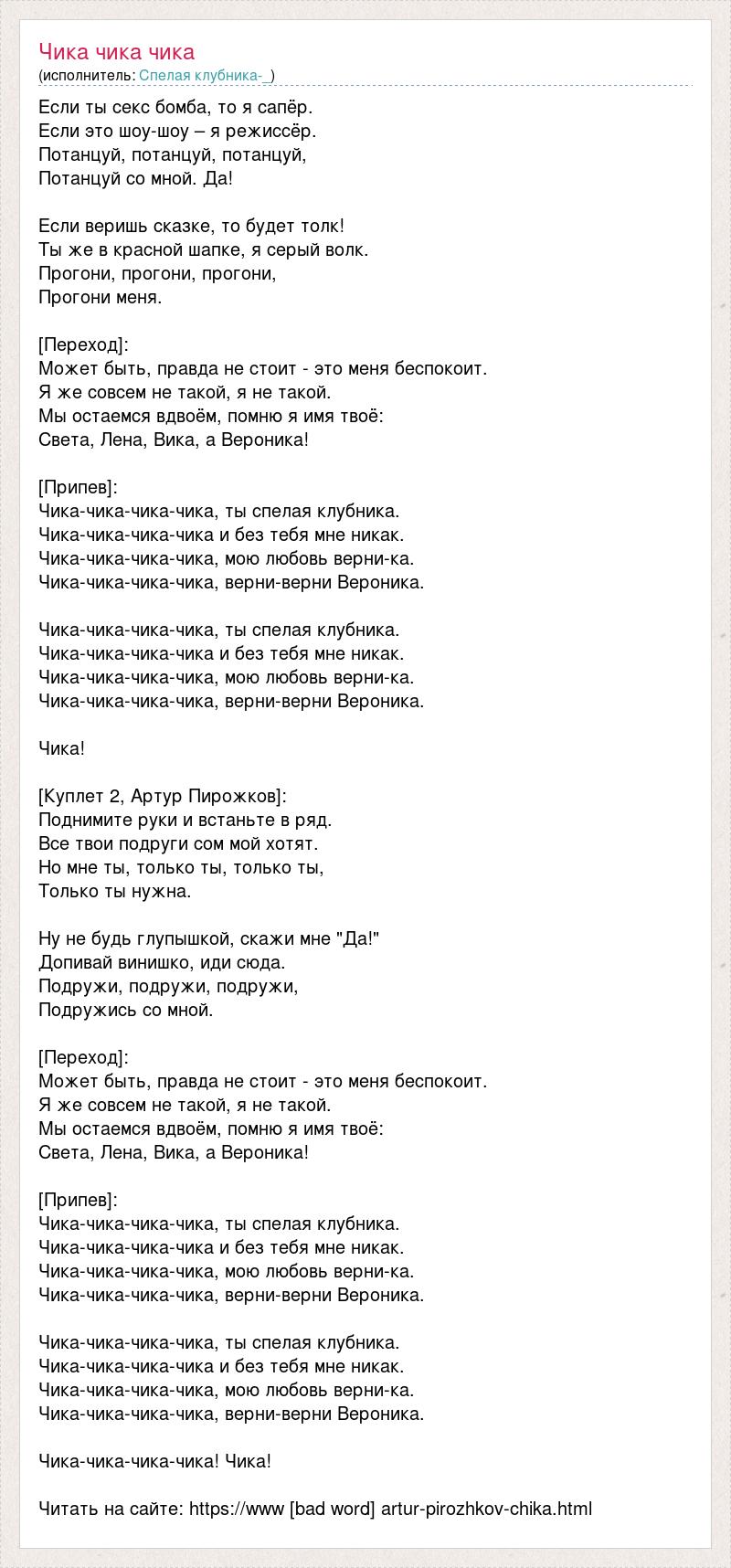 Если ты секс бомба, то я сапёр. Если это шоу-шоу – я режиссёр. Потанцуй, потанцуй, потанцуй, Потанцуй со мной. Да! Если веришь сказке, то будет толк! Ты же в красной шапке, я серый волк. Прогони, прогони, прогони, Прогони меня. [Переход]: Может быть, правда не стоит - это меня беспокоит. Я же совсем не такой, я не такой. Мы остаемся вдвоём, помню я имя твоё: Света, Лена, Вика, а Вероника! [Припев]: Чика-чика-чика-чика, ты спелая клубника. Чика-чика-чика-чика и без тебя мне никак. Чика-чика-чика-чика, мою любовь верни-ка. Чика-чика-чика-чика, верни-верни Вероника. Чика-чика-чика-чика, ты спелая клубника. Чика-чика-чика-чика и без тебя мне никак. Чика-чика-чика-чика, мою любовь верни-ка. Чика-чика-чика-чика, верни-верни Вероника. Чика! [Куплет 2, Артур Пирожков]: Поднимите руки и встаньте в ряд. Все твои подруги сом мой хотят. Но мне ты, только ты, только ты, Только ты нужна. Ну не будь глупышкой, скажи мне "Да!" Допивай винишко, иди сюда. Подружи, подружи, подружи, Подружись со мной. [Переход]: Может быть, правда не стоит - это меня беспокоит. Я же совсем не такой, я не такой. Мы остаемся вдвоём, помню я имя твоё: Света, Лена, Вика, а Вероника! [Припев]: Чика-чика-чика-чика, ты спелая клубника. Чика-чика-чика-чика и без тебя мне никак. Чика-чика-чика-чика, мою любовь верни-ка. Чика-чика-чика-чика, верни-верни Вероника. Чика-чика-чика-чика, ты спелая клубника. Чика-чика-чика-чика и без тебя мне никак. Чика-чика-чика-чика, мою любовь верни-ка. Чика-чика-чика-чика, верни-верни Вероника. Чика-чика-чика-чика! Чика! Читать на сайте: https://www [bad word] artur-pirozhkov-chika.html