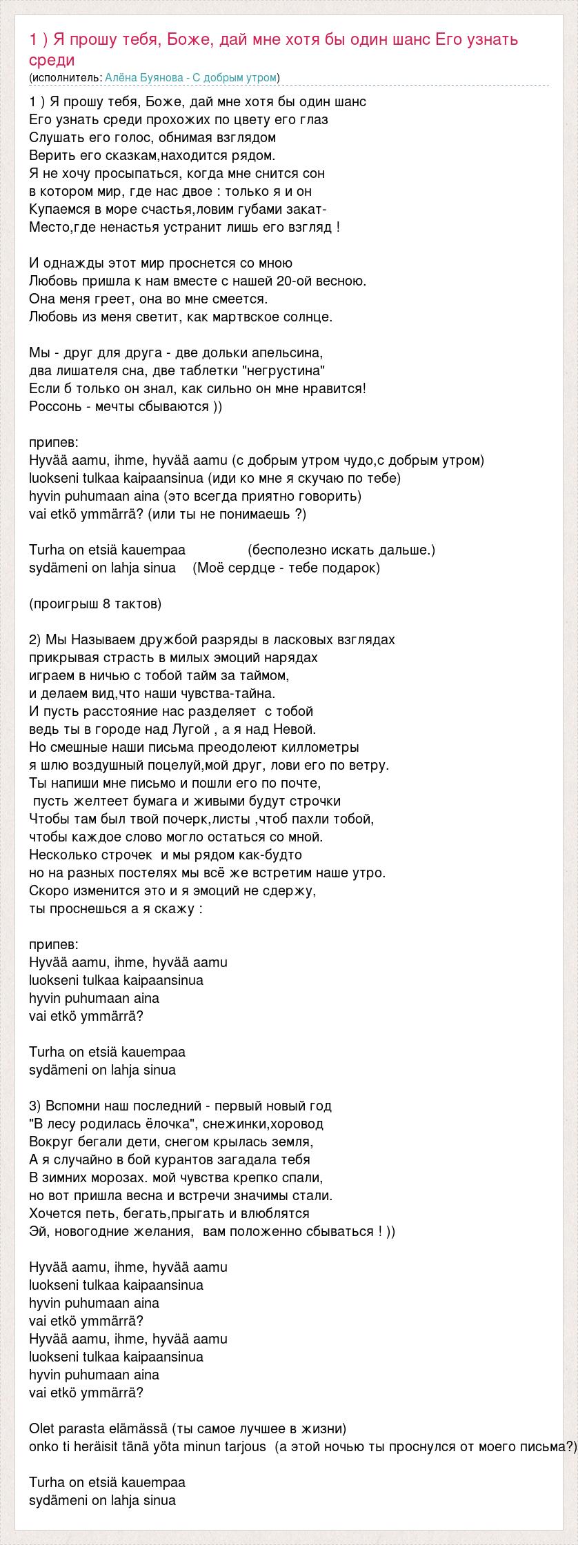 1 ) Я прошу тебя, Боже, дай мне хотя бы один шанс Его узнать среди прохожих по цвету его глаз Слушать его голос, обнимая взглядом Верить его сказкам,находится рядом. Я не хочу просыпаться, когда мне снится сон в котором мир, где нас двое : только я и он Купаемся в море счастья,ловим губами закат- Место,где ненастья устранит лишь его взгляд ! И однажды этот мир проснется со мною Любовь пришла к нам вместе с нашей 20-ой весною. Она меня греет, она во мне смеется. Любовь из меня светит, как мартвское солнце. Мы - друг для друга - две дольки апельсина, два лишателя сна, две таблетки "негрустина" Если б только он знал, как сильно он мне нравится! Россонь - мечты сбываются )) припев: Hyvää aamu, ihme, hyvää aamu (с добрым утром чудо,с добрым утром) luokseni tulkaa kaipaansinua (иди ко мне я скучаю по тебе) hyvin puhumaan aina (это всегда приятно говорить) vai etkö ymmärrä? (или ты не понимаешь ?) Turha on etsiä kauempaa (бесполезно искать дальше.) sydämeni on lahja sinua (Моё сердце - тебе подарок) (проигрыш 8 тактов) 2) Мы Называем дружбой разряды в ласковых взглядах прикрывая страсть в милых эмоций нарядах играем в ничью с тобой тайм за таймом, и делаем вид,что наши чувства-тайна. И пусть расстояние нас разделяет с тобой ведь ты в городе над Лугой , а я над Невой. Но смешные наши письма преодолеют киллометры я шлю воздушный поцелуй,мой друг, лови его по ветру. Ты напиши мне письмо и пошли его по почте, пусть желтеет бумага и живыми будут строчки Чтобы там был твой почерк,листы ,чтоб пахли тобой, чтобы каждое слово могло остаться со мной. Несколько строчек и мы рядом как-будто но на разных постелях мы всё же встретим наше утро. Скоро изменится это и я эмоций не сдержу, ты проснешься а я скажу : припев: Hyvää aamu, ihme, hyvää aamu luokseni tulkaa kaipaansinua hyvin puhumaan aina vai etkö ymmärrä? Turha on etsiä kauempaa sydämeni on lahja sinua 3) Вспомни наш последний - первый новый год "В лесу родилась ёлочка", снежинки,хоровод Вокруг бегали дети, снегом крылась земля, А я случайно в бой курантов загадала тебя В зимних морозах. мой чувства крепко спали, но вот пришла весна и встречи значимы стали. Хочется петь, бегать,прыгать и влюблятся Эй, новогодние желания, вам положенно сбываться ! )) Hyvää aamu, ihme, hyvää aamu luokseni tulkaa kaipaansinua hyvin puhumaan aina vai etkö ymmärrä? Hyvää aamu, ihme, hyvää aamu luokseni tulkaa kaipaansinua hyvin puhumaan aina vai etkö ymmärrä? Olet parasta elämässä (ты самое лучшее в жизни) onko ti heräisit tänä yöta minun tarjous (а этой ночью ты проснулся от моего письма?) Turha on etsiä kauempaa sydämeni on lahja sinua