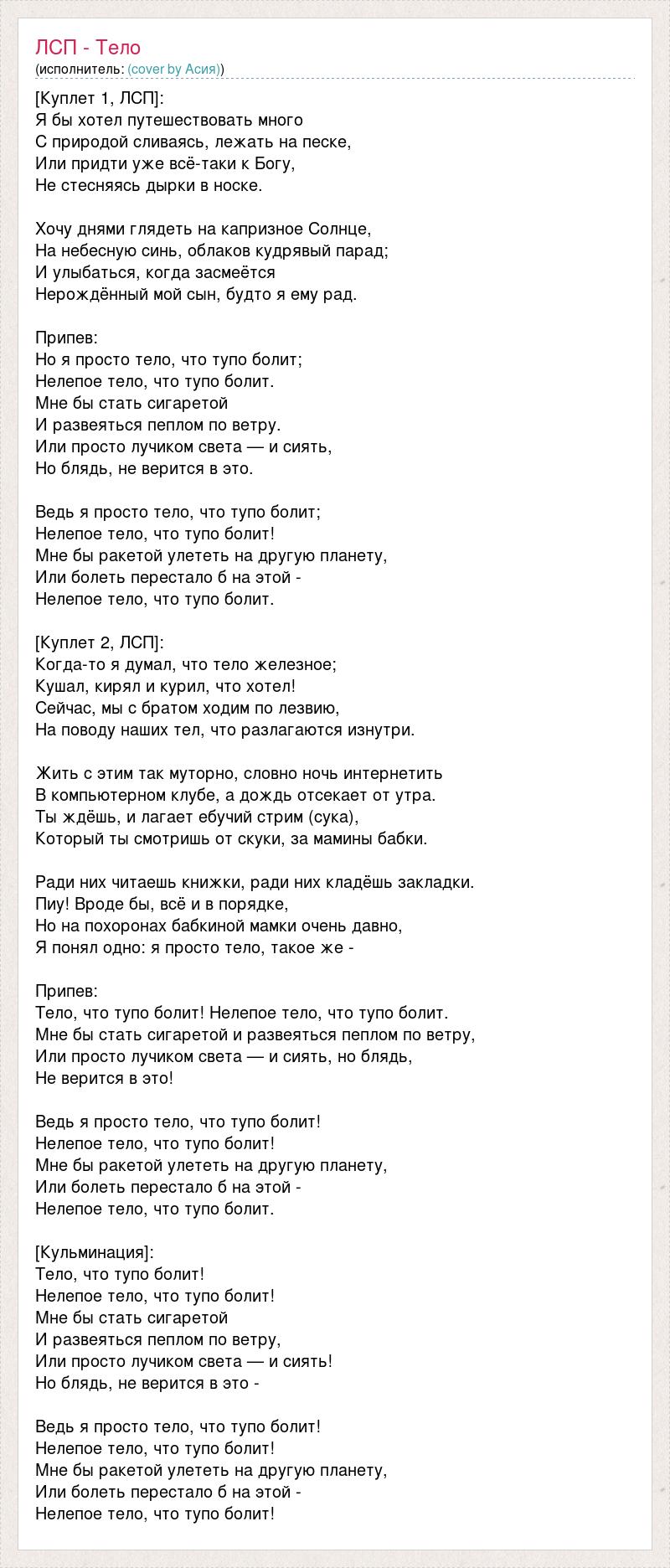 [Куплет 1, ЛСП]: Я бы хотел путешествовать много С природой сливаясь, лежать на песке, Или придти уже всё-таки к Богу, Не стесняясь дырки в носке. Хочу днями глядеть на капризное Солнце, На небесную синь, облаков кудрявый парад; И улыбаться, когда засмеётся Нерождённый мой сын, будто я ему рад. Припев: Но я просто тело, что тупо болит; Нелепое тело, что тупо болит. Мне бы стать сигаретой И развеяться пеплом по ветру. Или просто лучиком света — и сиять, Но блядь, не верится в это. Ведь я просто тело, что тупо болит; Нелепое тело, что тупо болит! Мне бы ракетой улететь на другую планету, Или болеть перестало б на этой - Нелепое тело, что тупо болит. [Куплет 2, ЛСП]: Когда-то я думал, что тело железное; Кушал, кирял и курил, что хотел! Сейчас, мы с братом ходим по лезвию, На поводу наших тел, что разлагаются изнутри. Жить с этим так муторно, словно ночь интернетить В компьютерном клубе, а дождь отсекает от утра. Ты ждёшь, и лагает ебучий стрим (сука), Который ты смотришь от скуки, за мамины бабки. Ради них читаешь книжки, ради них кладёшь закладки. Пиу! Вроде бы, всё и в порядке, Но на похоронах бабкиной мамки очень давно, Я понял одно: я просто тело, такое же - Припев: Тело, что тупо болит! Нелепое тело, что тупо болит. Мне бы стать сигаретой и развеяться пеплом по ветру, Или просто лучиком света — и сиять, но блядь, Не верится в это! Ведь я просто тело, что тупо болит! Нелепое тело, что тупо болит! Мне бы ракетой улететь на другую планету, Или болеть перестало б на этой - Нелепое тело, что тупо болит. [Кульминация]: Тело, что тупо болит! Нелепое тело, что тупо болит! Мне бы стать сигаретой И развеяться пеплом по ветру, Или просто лучиком света — и сиять! Но блядь, не верится в это - Ведь я просто тело, что тупо болит! Нелепое тело, что тупо болит! Мне бы ракетой улететь на другую планету, Или болеть перестало б на этой - Нелепое тело, что тупо болит!