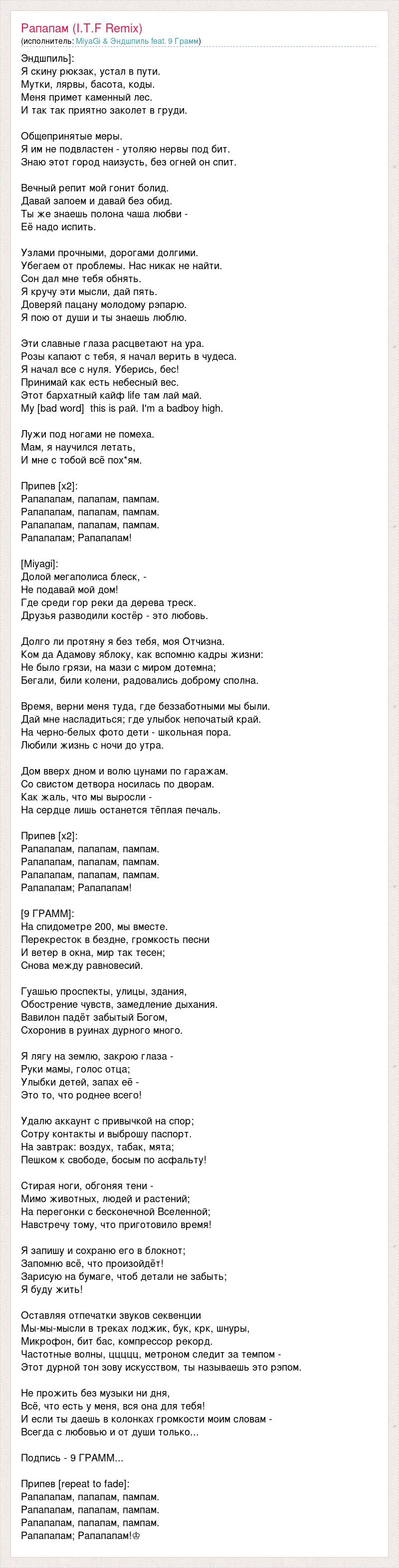 Эндшпиль]: Я скину рюкзак, устал в пути. Мутки, лярвы, басота, коды. Меня примет каменный лес. И так так приятно заколет в груди. Общепринятые меры. Я им не подвластен - утоляю нервы под бит. Знаю этот город наизусть, без огней он спит. Вечный репит мой гонит болид. Давай запоем и давай без обид. Ты же знаешь полона чаша любви - Её надо испить. Узлами прочными, дорогами долгими. Убегаем от проблемы. Нас никак не найти. Сон дал мне тебя обнять. Я кручу эти мысли, дай пять. Доверяй пацану молодому рэпарю. Я пою от души и ты знаешь люблю. Эти славные глаза расцветают на ура. Розы капают с тебя, я начал верить в чудеса. Я начал все с нуля. Уберись, бес! Принимай как есть небесный вес. Этот бархатный кайф life там лай май. My [bad word] this is рай. I'm a badboy high. Лужи под ногами не помеха. Мам, я научился летать, И мне с тобой всё пох*ям. Припев [x2]: Рапапапам, папапам, пампам. Рапапапам, папапам, пампам. Рапапапам, папапам, пампам. Рапапапам; Рапапапам! [Miyagi]: Долой мегаполиса блеск, - Не подавай мой дом! Где среди гор реки да дерева треск. Друзья разводили костёр - это любовь. Долго ли протяну я без тебя, моя Отчизна. Ком да Адамову яблоку, как вспомню кадры жизни: Не было грязи, на мази с миром дотемна; Бегали, били колени, радовались доброму сполна. Время, верни меня туда, где беззаботными мы были. Дай мне насладиться; где улыбок непочатый край. На черно-белых фото дети - школьная пора. Любили жизнь с ночи до утра. Дом вверх дном и волю цунами по гаражам. Со свистом детвора носилась по дворам. Как жаль, что мы выросли - На сердце лишь останется тёплая печаль. Припев [x2]: Рапапапам, папапам, пампам. Рапапапам, папапам, пампам. Рапапапам, папапам, пампам. Рапапапам; Рапапапам! [9 ГРАММ]: На спидометре 200, мы вместе. Перекресток в бездне, громкость песни И ветер в окна, мир так тесен; Снова между равновесий. Гуашью проспекты, улицы, здания, Обострение чувств, замедление дыхания. Вавилон падёт забытый Богом, Схоронив в руинах дурного много. Я лягу на землю, закрою глаза - Руки мамы, голос отца; Улыбки детей, запах её - Это то, что роднее всего! Удалю аккаунт с привычкой на спор; Сотру контакты и выброшу паспорт. На завтрак: воздух, табак, мята; Пешком к свободе, босым по асфальту! Стирая ноги, обгоняя тени - Мимо животных, людей и растений; На перегонки с бесконечной Вселенной; Навстречу тому, что приготовило время! Я запишу и сохраню его в блокнот; Запомню всё, что произойдёт! Зарисую на бумаге, чтоб детали не забыть; Я буду жить! Оставляя отпечатки звуков секвенции Мы-мы-мысли в треках лоджик, бук, крк, шнуры, Микрофон, бит бас, компрессор рекорд. Частотные волны, ццццц, метроном следит за темпом - Этот дурной тон зову искусством, ты называешь это рэпом. Не прожить без музыки ни дня, Всё, что есть у меня, вся она для тебя! И если ты даешь в колонках громкости моим словам - Всегда с любовью и от души только... Подпись - 9 ГРАММ... Припев [repeat to fade]: Рапапапам, папапам, пампам. Рапапапам, папапам, пампам. Рапапапам, папапам, пампам. Рапапапам; Рапапапам!♔
