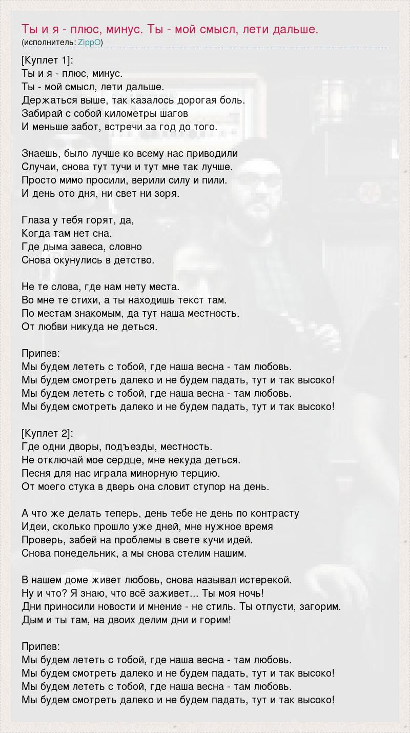 [Куплет 1]: Ты и я - плюс, минус. Ты - мой смысл, лети дальше. Держаться выше, так казалось дорогая боль. Забирай с собой километры шагов И меньше забот, встречи за год до того. Знаешь, было лучше ко всему нас приводили Случаи, снова тут тучи и тут мне так лучше. Просто мимо просили, верили силу и пили. И день ото дня, ни свет ни зоря. Глаза у тебя горят, да, Когда там нет сна. Где дыма завеса, словно Снова окунулись в детство. Не те слова, где нам нету места. Во мне те стихи, а ты находишь текст там. По местам знакомым, да тут наша местность. От любви никуда не деться. Припев: Мы будем лететь с тобой, где наша весна - там любовь. Мы будем смотреть далеко и не будем падать, тут и так высоко! Мы будем лететь с тобой, где наша весна - там любовь. Мы будем смотреть далеко и не будем падать, тут и так высоко! [Куплет 2]: Где одни дворы, подъезды, местность. Не отключай мое сердце, мне некуда деться. Песня для нас играла минорную терцию. От моего стука в дверь она словит ступор на день. А что же делать теперь, день тебе не день по контрасту Идеи, сколько прошло уже дней, мне нужное время Проверь, забей на проблемы в свете кучи идей. Снова понедельник, а мы снова стелим нашим. В нашем доме живет любовь, снова называл истерекой. Ну и что? Я знаю, что всё заживет... Ты моя ночь! Дни приносили новости и мнение - не стиль. Ты отпусти, загорим. Дым и ты там, на двоих делим дни и горим! Припев: Мы будем лететь с тобой, где наша весна - там любовь. Мы будем смотреть далеко и не будем падать, тут и так высоко! Мы будем лететь с тобой, где наша весна - там любовь. Мы будем смотреть далеко и не будем падать, тут и так высоко!