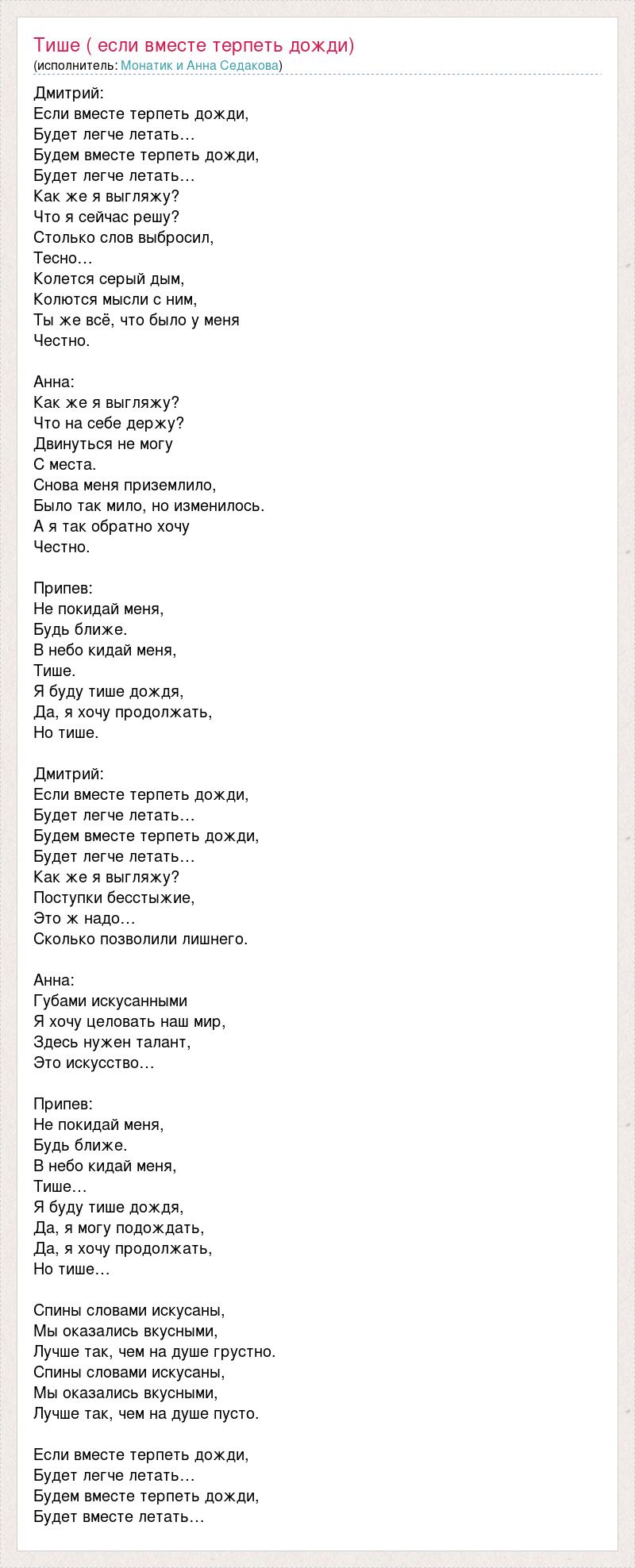 Дмитрий: Если вместе терпеть дожди, Будет легче летать… Будем вместе терпеть дожди, Будет легче летать… Как же я выгляжу? Что я сейчас решу? Столько слов выбросил, Тесно… Колется серый дым, Колются мысли с ним, Ты же всё, что было у меня Честно. Анна: Как же я выгляжу? Что на себе держу? Двинуться не могу С места. Снова меня приземлило, Было так мило, но изменилось. А я так обратно хочу Честно. Припев: Не покидай меня, Будь ближе. В небо кидай меня, Тише. Я буду тише дождя, Да, я хочу продолжать, Но тише. Дмитрий: Если вместе терпеть дожди, Будет легче летать… Будем вместе терпеть дожди, Будет легче летать… Как же я выгляжу? Поступки бесстыжие, Это ж надо… Сколько позволили лишнего. Анна: Губами искусанными Я хочу целовать наш мир, Здесь нужен талант, Это искусство… Припев: Не покидай меня, Будь ближе. В небо кидай меня, Тише… Я буду тише дождя, Да, я могу подождать, Да, я хочу продолжать, Но тише… Спины словами искусаны, Мы оказались вкусными, Лучше так, чем на душе грустно. Спины словами искусаны, Мы оказались вкусными, Лучше так, чем на душе пусто. Если вместе терпеть дожди, Будет легче летать… Будем вместе терпеть дожди, Будет вместе летать…