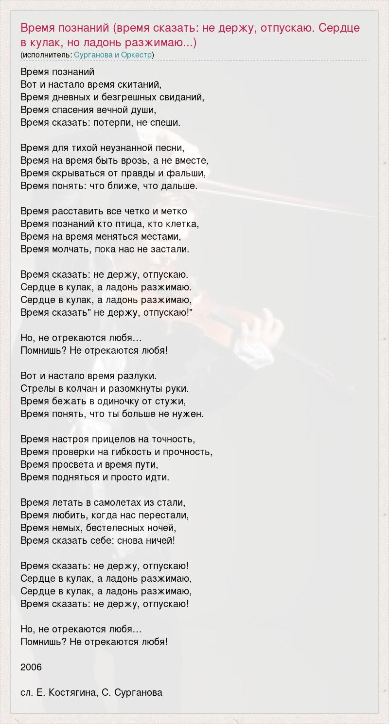 Время познаний Вот и настало время скитаний, Время дневных и безгрешных свиданий, Время спасения вечной души, Время сказать: потерпи, не спеши. Время для тихой неузнанной песни, Время на время быть врозь, а не вместе, Время скрываться от правды и фальши, Время понять: что ближе, что дальше. Время расставить все четко и метко Время познаний кто птица, кто клетка, Время на время меняться местами, Время молчать, пока нас не застали. Время сказать: не держу, отпускаю. Сердце в кулак, а ладонь разжимаю. Сердце в кулак, а ладонь разжимаю, Время сказать" не держу, отпускаю!" Но, не отрекаются любя… Помнишь? Не отрекаются любя! Вот и настало время разлуки. Стрелы в колчан и разомкнуты руки. Время бежать в одиночку от стужи, Время понять, что ты больше не нужен. Время настроя прицелов на точность, Время проверки на гибкость и прочность, Время просвета и время пути, Время подняться и просто идти. Время летать в самолетах из стали, Время любить, когда нас перестали, Время немых, бестелесных ночей, Время сказать себе: снова ничей! Время сказать: не держу, отпускаю! Сердце в кулак, а ладонь разжимаю, Сердце в кулак, а ладонь разжимаю, Время сказать: не держу, отпускаю! Но, не отрекаются любя… Помнишь? Не отрекаются любя! 2006 сл. Е. Костягина, С. Сурганова