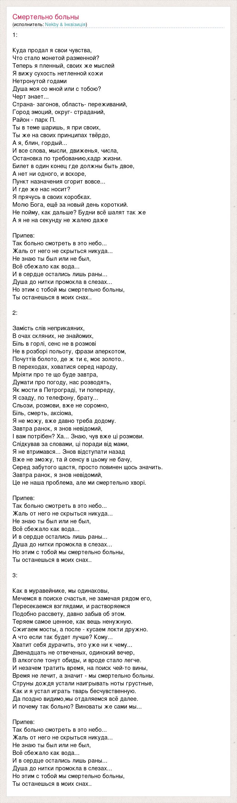 1: Куда продал я свои чувства, Что стало монетой разменной? Теперь я пленный, своих же мыслей Я вижу сухость нетленной кожи Нетронутой годами Душа моя со мной или с тобою? Черт знает... Страна- загонов, область- переживаний, Город эмоций, округ- страданий, Район - парк П. Ты в теме шаришь, я при своих, Ты же на своих принципах твёрдо, А я, блин, гордый... И все слова, мысли, движенья, числа, Остановка по требованию,кадр жизни. Билет в один конец где должны быть двое, А нет ни одного, и вскоре, Пункт назначения сгорит вовсе... И где же нас носит? Я прячусь в своих коробках. Молю Бога, ещё за новый день короткий. Не пойму, как дальше? Будни всё шалят так же А я не на секунду не жалею даже Припев: Так больно смотреть в это небо... Жаль от него не скрыться никуда... Не знаю ты был или не был, Всё сбежало как вода... И в сердце остались лишь раны... Душа до нитки промокла в слезах... Но этим с тобой мы смертельно больны, Ты останешься в моих снах.. 2: Замість слів неприкаяних, В очах скляних, не знайомих, Біль в горлі, сенс не в розмові Не в розборі польоту, фрази аперкотом, Почуттів болото, де ж ти є, моє золото.. В переходах, ховатися серед народу, Мріяти про те що буде завтра, Думати про погоду, нас розводять, Як мости в Петрограді, ти попереду, Я сзаду, по телефону, брату... Сльози, розмови, вже не соромно, Біль, смерть, аксіома, Я не можу, вже давно треба додому. Завтра ранок, я знов невідомий, І вам потрібен? Ха... Знаю, чув вже ці розмови. Слідкував за словами, ці поради від мами, Я не втримався... Знов відступати назад Вже не зможу, та й сенсу в цьому не бачу, Серед забутого щастя, просто повинен щось значить. Завтра ранок, я знов невідомий, Це не наша проблема, але ми смертельно хворі. Припев: Так больно смотреть в это небо... Жаль от него не скрыться никуда... Не знаю ты был или не был, Всё сбежало как вода... И в сердце остались лишь раны... Душа до нитки промокла в слезах... Но этим с тобой мы смертельно больны, Ты останешься в моих снах.. 3: Как в муравейнике, мы одинаковы, Мечемся в поиске счастья, не замечая рядом его, Пересекаемся взглядами, и растворяемся Подобно рассвету, давно забыв об этом. Теряем самое ценное, как вещь ненужную. Сжигаем мосты, а после - кусаем локти дружно. А что если так будет лучше? Кому... Хватит себя дурачить, это уже ни к чему... Двенадцать не отвеченых, одинокий вечер, В алкоголе тонут обиды, и вроде стало легче. И незачем тратить время, на поиск чей-то вины, Время не лечит, а значит - мы смертельно больны. Струны дождя устали наигрывать ноты грустные, Как и я устал играть тварь бесчувственную. Да поздно видимо,мы отдаляемся всё далее. И почему так больно? Виноваты же сами мы... Припев: Так больно смотреть в это небо... Жаль от него не скрыться никуда... Не знаю ты был или не был, Всё сбежало как вода... И в сердце остались лишь раны... Душа до нитки промокла в слезах... Но этим с тобой мы смертельно больны, Ты останешься в моих снах..
