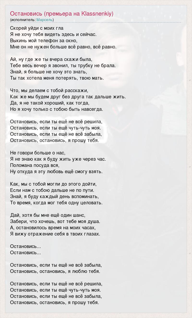 Скорей уйди с моих гла Я не хочу тебя видеть здесь и сейчас. Выкинь мой телефон за окно, Мне он не нужен больше всё равно, всё равно. Ай, ну где же ты вчера скажи была, Тебе весь вечер я звонил, ты трубку не брала. Знай, я больше не хочу это знать, Ты так хотела меня потерять, твою мать. Что, мы делаем с тобой расскажи, Как же мы будем друг без друга так дальше жить. Да, я не такой хороший, как тогда, Но я хочу только с тобою быть навсегда. Остановись, если ты ещё не всё решила, Остановись, если ты ещё чуть-чуть моя. Остановись, если ты ещё не всё забыла, Остановись, остановись, я прошу тебя. Не говори больше о нас, Я не знаю как я буду жить уже через час. Поломана посуда вся, Ну откуда я эту любовь ещё смогу взять. Как, мы с тобой могли до этого дойти, Если нам с тобою дальше не по пути. Знай, я буду каждый день вспоминать, То время, когда мог тебя одну целовать. Дай, хотя бы мне ещё один шанс, Забери, что хочешь, вот тебе моя душа. А, остановилось время на моих часах, Я вижу отражение себя в твоих глазах. Остановись... Остановись... Остановись, если ты ещё не всё забыла, Остановись, остановись, я люблю тебя. Остановись, если ты ещё не всё решила, Остановись, если ты ещё чуть-чуть моя. Остановись, если ты ещё не всё забыла, Остановись, остановись, я прошу тебя.