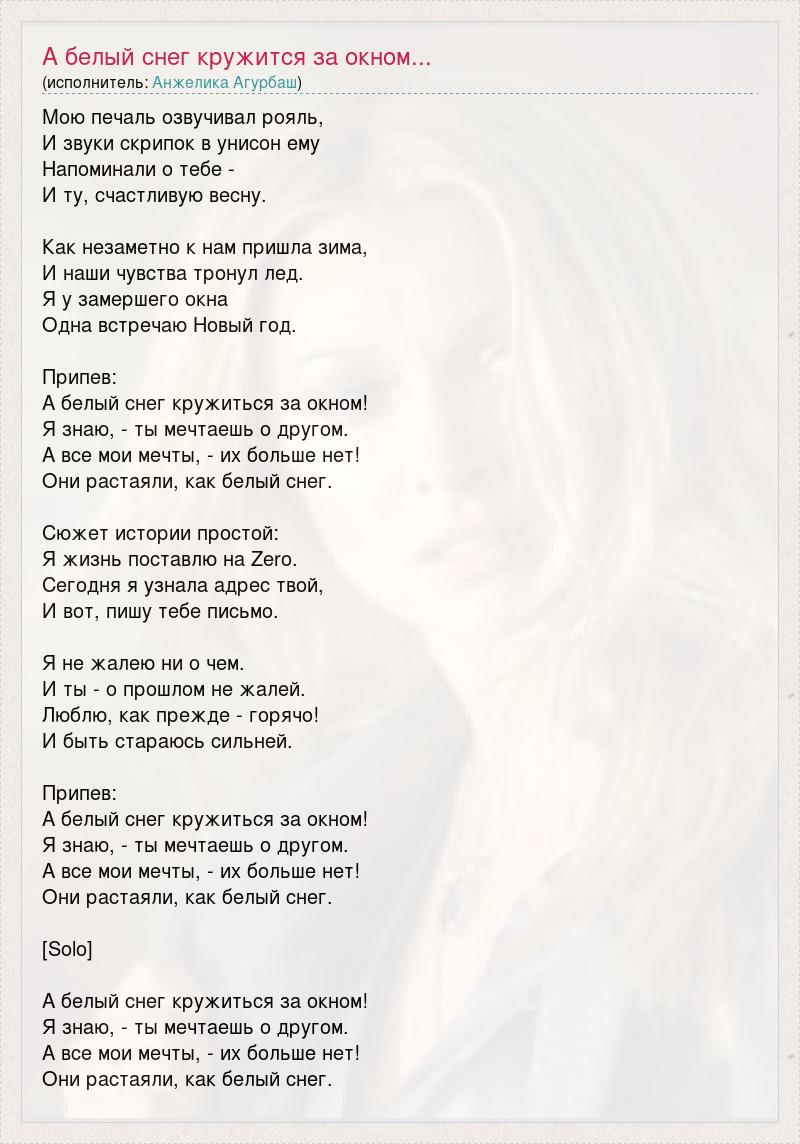 Мою печаль озвучивал рояль, И звуки скрипок в унисон ему Напоминали о тебе - И ту, счастливую весну. Как незаметно к нам пришла зима, И наши чувства тронул лед. Я у замершего окна Одна встречаю Новый год. Припев: А белый снег кружиться за окном! Я знаю, - ты мечтаешь о другом. А все мои мечты, - их больше нет! Они растаяли, как белый снег. Сюжет истории простой: Я жизнь поставлю на Zero. Сегодня я узнала адрес твой, И вот, пишу тебе письмо. Я не жалею ни о чем. И ты - о прошлом не жалей. Люблю, как прежде - горячо! И быть стараюсь сильней. Припев: А белый снег кружиться за окном! Я знаю, - ты мечтаешь о другом. А все мои мечты, - их больше нет! Они растаяли, как белый снег. [Solo] А белый снег кружиться за окном! Я знаю, - ты мечтаешь о другом. А все мои мечты, - их больше нет! Они растаяли, как белый снег.