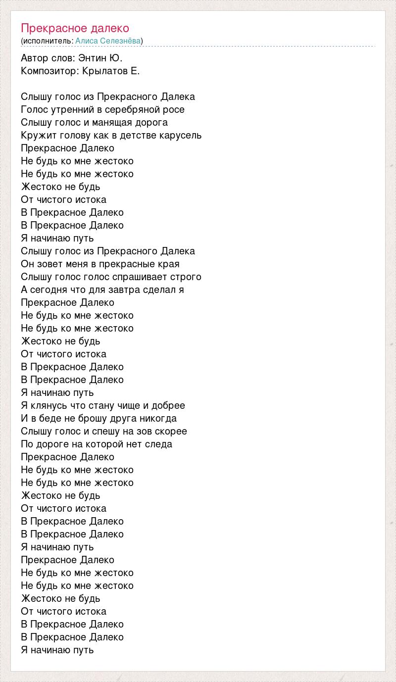 Автор слов: Энтин Ю. Композитор: Крылатов Е. Слышу голос из Прекрасного Далека Голос утренний в серебряной росе Слышу голос и манящая дорога Кружит голову как в детстве карусель Прекрасное Далеко Не будь ко мне жестоко Не будь ко мне жестоко Жестоко не будь От чистого истока В Прекрасное Далеко В Прекрасное Далеко Я начинаю путь Слышу голос из Прекрасного Далека Он зовет меня в прекрасные края Слышу голос голос спрашивает строго А сегодня что для завтра сделал я Прекрасное Далеко Не будь ко мне жестоко Не будь ко мне жестоко Жестоко не будь От чистого истока В Прекрасное Далеко В Прекрасное Далеко Я начинаю путь Я клянусь что стану чище и добрее И в беде не брошу друга никогда Слышу голос и спешу на зов скорее По дороге на которой нет следа Прекрасное Далеко Не будь ко мне жестоко Не будь ко мне жестоко Жестоко не будь От чистого истока В Прекрасное Далеко В Прекрасное Далеко Я начинаю путь Прекрасное Далеко Не будь ко мне жестоко Не будь ко мне жестоко Жестоко не будь От чистого истока В Прекрасное Далеко В Прекрасное Далеко Я начинаю путь