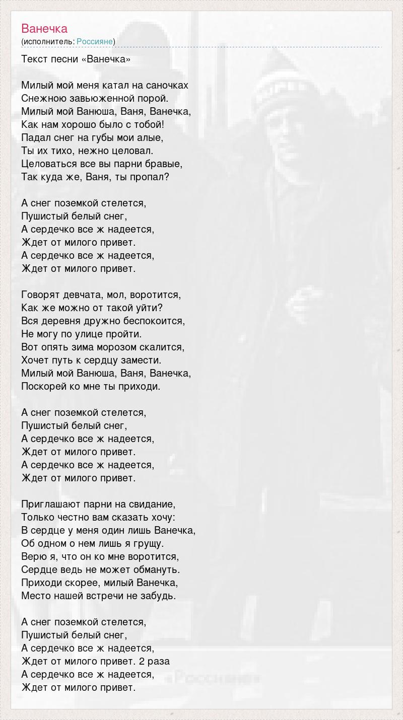 Текст песни «Ванечка» Милый мой меня катал на саночках Снежною завьюженной порой. Милый мой Ванюша, Ваня, Ванечка, Как нам хорошо было с тобой! Падал снег на губы мои алые, Ты их тихо, нежно целовал. Целоваться все вы парни бравые, Так куда же, Ваня, ты пропал? А снег поземкой стелется, Пушистый белый снег, А сердечко все ж надеется, Ждет от милого привет. А сердечко все ж надеется, Ждет от милого привет. Говорят девчата, мол, воротится, Как же можно от такой уйти? Вся деревня дружно беспокоится, Не могу по улице пройти. Вот опять зима морозом скалится, Хочет путь к сердцу замести. Милый мой Ванюша, Ваня, Ванечка, Поскорей ко мне ты приходи. А снег поземкой стелется, Пушистый белый снег, А сердечко все ж надеется, Ждет от милого привет. А сердечко все ж надеется, Ждет от милого привет. Приглашают парни на свидание, Только честно вам сказать хочу: В сердце у меня один лишь Ванечка, Об одном о нем лишь я грущу. Верю я, что он ко мне воротится, Сердце ведь не может обмануть. Приходи скорее, милый Ванечка, Место нашей встречи не забудь. А снег поземкой стелется, Пушистый белый снег, А сердечко все ж надеется, Ждет от милого привет. 2 раза А сердечко все ж надеется, Ждет от милого привет.